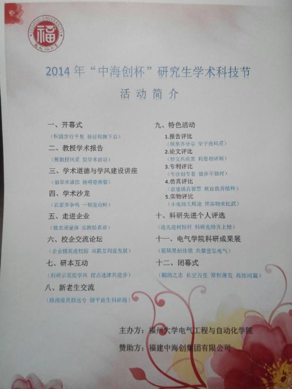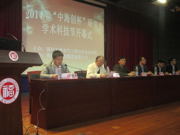 2014年“中海创”杯研究生学术科技节开幕式。学院党委何希耕书记,学院院长\博士生导师陈为教授,学院副院长缪希仁教授、学院党委副书记黄国辉老师、博士生导师张培铭教授、中海创集团林泽生副总经理、自动化系陈少斌书记、电力工程系主任郭谋发副教授、黄宴伟博士、研究生辅导员许海燕老师出席开幕式。开幕式共有研究生代表200余人参加。开幕式由学院党委黄国辉副书记主持。