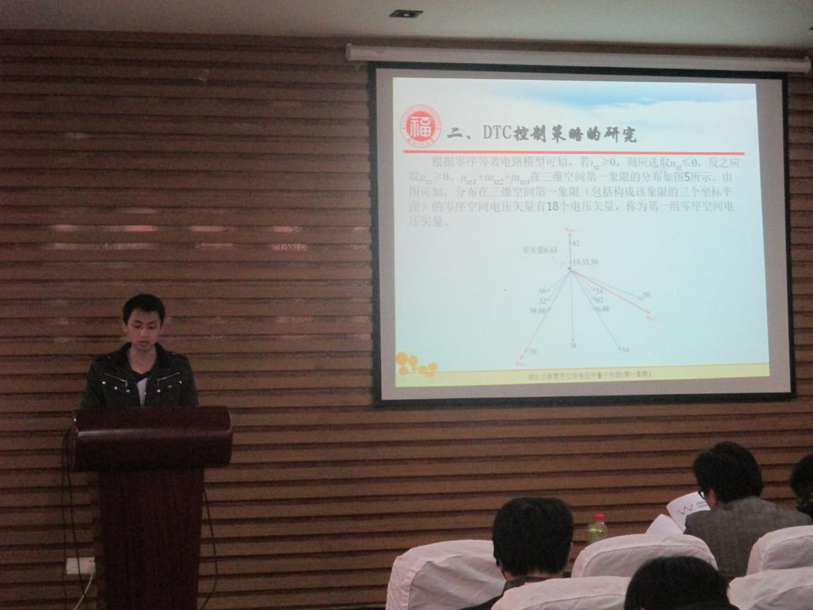 首先,柳松同学介绍了《基于荧光光纤的温度在线检测系统研究》,该系统以自主研发的荧光光纤温度传感设备为基础,可以进行实时有效连续的温度检测,具有抗电磁干扰、电绝缘、体积小、耐腐蚀、测试精度可靠稳定等优点,对于高压电气设备的温度测控针对性强,具有较好的实用性和经济性。接着,罗海海同学介绍了《组合式开关分相控制技术》,该技术解决了多相交流控制开关的同步控制问题。然后,王建明同学讲解了《一种基于短路故障早期检测的新型保护技术》,提出了一种中压线路短路早期检测及其故障限流技术,并以固态可控串联谐振型FCL为例进行实验验证。接着,苏尚流同学介绍《微型无刷四轴飞行器研究》,此微型无刷四轴飞行器工作过程在于测量惯性测量元件(加速度计、陀螺仪)上、加上滤波算法、解算角度算法等最终使飞行器能平稳飞行,且拥有比有刷四轴更好的续航能力。休息片刻后,柳百毅同学介绍了《脉宽调制波形下磁芯损耗测量装置设计》,该装置运用直流法的思想对磁件的损耗进行测量,通过结合上位机的可视化控制,能够对磁芯损耗进行快速的测量,且操作简便。接着,熊先云同学介绍了《基于三维零序空间电压矢量的新型直接转矩控制》该控制策略在定子磁链及电磁转矩受控情况下,能够很好地将四个零序电流控制到零,并且解决了逆变器死区等非线性带来的相电流畸变问题。最后,李超同学介绍了《成像式光学电流传感器的研制》,针对现有OCT检测模式的局限性,提出了一种采用法拉第旋转角成像的高压大电流检测方法。