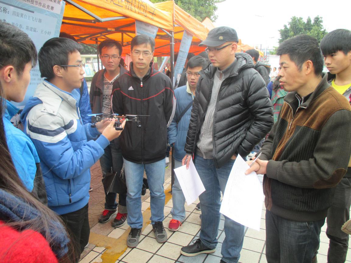 本次科技展同时展示了研究生与本科生的科研成果,并由评委老师对本科生的科研成果进行比赛评分。第一个参赛作品为平衡杆小车,采用电位器角位移传感器测量平衡杆角度和线性ccd感应赛道,结合传感器反馈的信息运用PD算法将控制信号传输给电机驱动,使小车保持摆杆垂直行走。第二个参赛作品双足机器人,采用STM32微控制器控制机器人进行双足直立行走,控制关键为机器人重心的把握,通过控制6个舵机的同时调节,实现重心地交替转移来完成机器人的各项动作。随后的参赛作品为四轴飞行器,通过陀螺仪、电子罗盘、超声波测距等模块采集数据并输出给控制板,采用PID算法对数据进行处理,算出相应电机的PWM增减量调节电机转速,使飞行器飞得更稳,实现从A区起飞,悬停,B区平稳降落。接下来是数字显示脉冲信号参数测试仪,本仪器可实现测量脉冲信号峰峰值、频率、有效值、占空比、上升沿和下降沿时间等参数。紧接着的参赛作品为灭火机器人,通过光传感器检测周围障碍信息判断房间位置,依靠抗干扰复眼分辨墙壁反射光来检测房间火焰,通过PID算法调节电机转动,移动至房间蜡烛位置,并喷射出水雾将火焰熄灭。随后还有简易旋转倒立摆及控制装置、智能舞蹈机器人和循迹直立智能小车等参赛作品的展示。在本科科研成果展示后,念平、柳百毅、王建明和张清波等研究生们为我们展示了各自的科研成果。