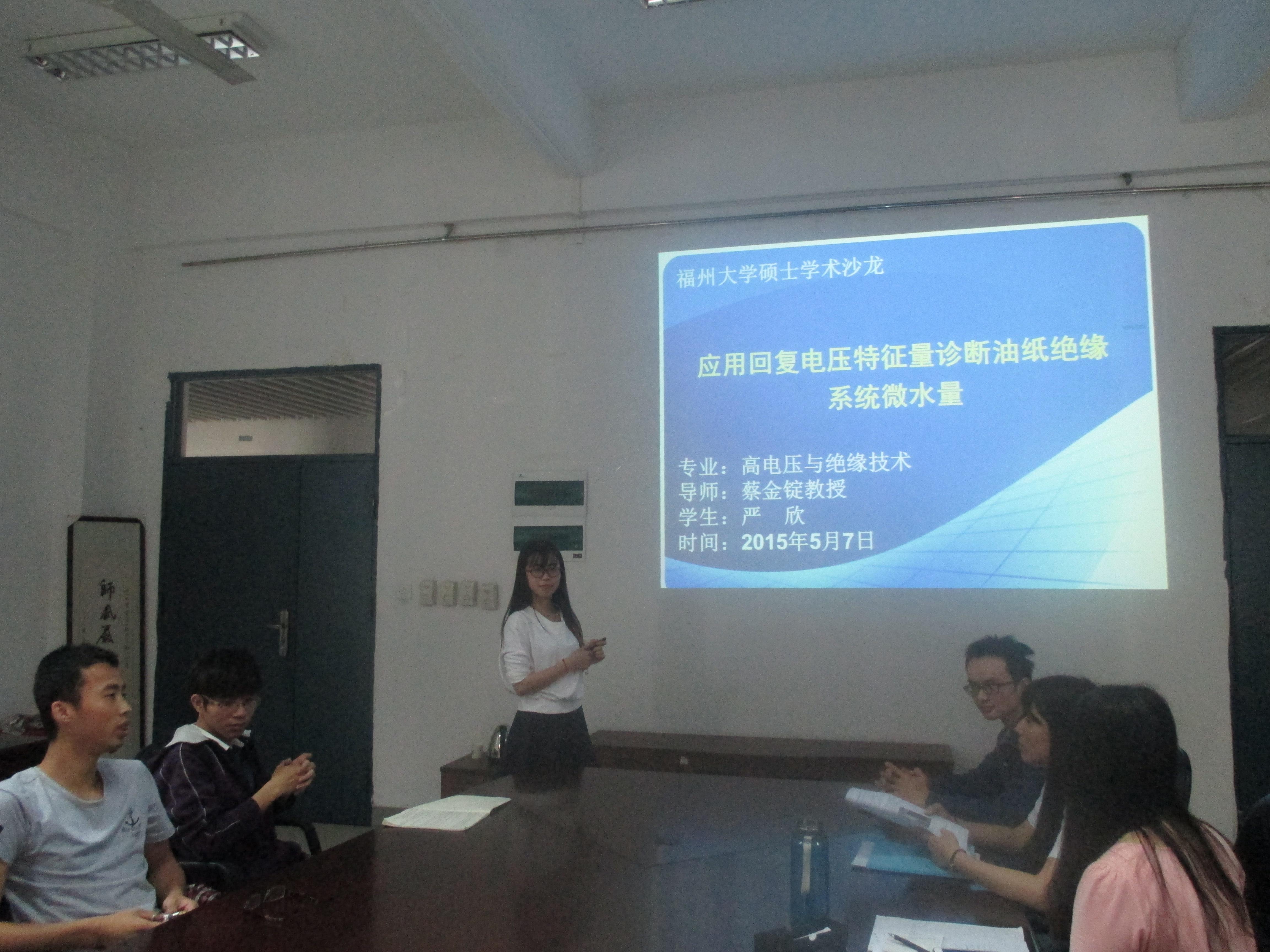 会议室举行了“中海创杯”研究生学术科技月学术沙龙第五场——电力系统专场。本次学术沙龙共有五位同学做了报告,内容涉及绝缘老化状态评估、配电网故障研究、配电网无功优化以及断路器故障早期的分断短路电流研究等不同领域内的技术,同时我们有幸邀请到郭谋发老师作为指导老师。