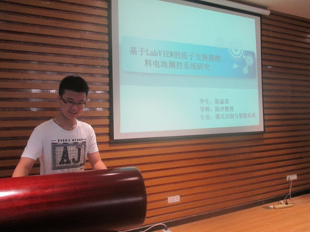 第一位上场的是陈溢琪同学,其报告的题目是《基于LabVIEW的PEMFC测控系统研究》,是一种基于LabVIEW的质子交换膜燃料电池的测控系统,并且针对特定的实验条件(1000W的燃料电池电堆及其外围设备),采用LabVIEW设计友好的人机界面,实现质子交换膜燃料电池测控系统的研究与设计。第二位同学刘晓程带着《基于集员滤波的基因调控网络研究》的题目上场,主要是利用MATLAB的LMI工具箱,对基因调控网络中的集员滤波问题进行了仿真,证明了所提算法的可行性。石钰芳同学是第三个上场的,其报告题目是《基于状态空间的APF检测控制一体化研究》,其课题旨在研究基于离散状态空间建模的LCL并联型有源电力滤波器的电流跟踪控制。通过全状态反馈的极点配置,来改善系统的动态响应和稳定性,实现抑制LCL滤波器并网逆变器的谐振,并有效减少阻尼损耗。紧接着,孙岩同学带来他的课题《基于模糊策略的荧光光纤测温系统研究》,其利用了MATLAB建立仿真模型进行实验验证,实验结果表明基于模糊策略的荧光光纤温度检测系统能有效地提高荧光寿命值检测的稳定性和准确性。接下来是熊少华同学,他的报告题目是《基于内模的永磁同步电机电流环观测器设计研究》,主要是针对永磁同步电机电流环存在参数摄动、干扰等不确定因素,提出一种基于内模控制的观测器来实现对电流补偿控制,抑制系统参数摄动和干扰等不确定因素,提高电流环的响应性能,增强系统的鲁棒性。陈怡同学接着上场,其报告题目是《基于扩展观测器的精确伺服控制系统》,课题研究电机伺服系统的高性能控制问题,特别是在未知负载转矩和摩擦转矩作用下如何实现快速、平稳且准确的位置精确控制策略,在基于TI 28335 DSP的永磁同步电机实验平台进行验证。接下去是何轩同学,他的报告题目是《基于粒子群算法优化支持向量机的专用工程费用量化研究》,其是参考分析国内外其它地区用户专用工程费用量化标准,提出适合地区实际情况的按测算用户专用工程配电变压器容量和用户专用工程线路长度来进行用户专用工程费用量化研究。其次是郑伊伶同学,其研究的课题是《基于工业自动化平台的信息安全风险评估》,其根据国内外相关标准,以工业自动化平台(IAP)作为研究对象,构建了IAP控制平台信息安全风险评估模型,结合基于熵权理论的模糊综合评价法与模糊层次分析法评估了IAP软件通信链路的风险,明确了IAP中包含的重要资产。最后是黄河远同学,他报告的题目是《基于分布参数模拟电荷法的变电站电场计算》,课题提出一种以分布参数来改进模拟电荷法的电场模型,根据相连两组导线不同的档距及弧垂计算电场,能够更准确地计算变电站电场强度,获得连续平滑的电场分布,同时能适用于多种导线布局的电场强度模拟计算。