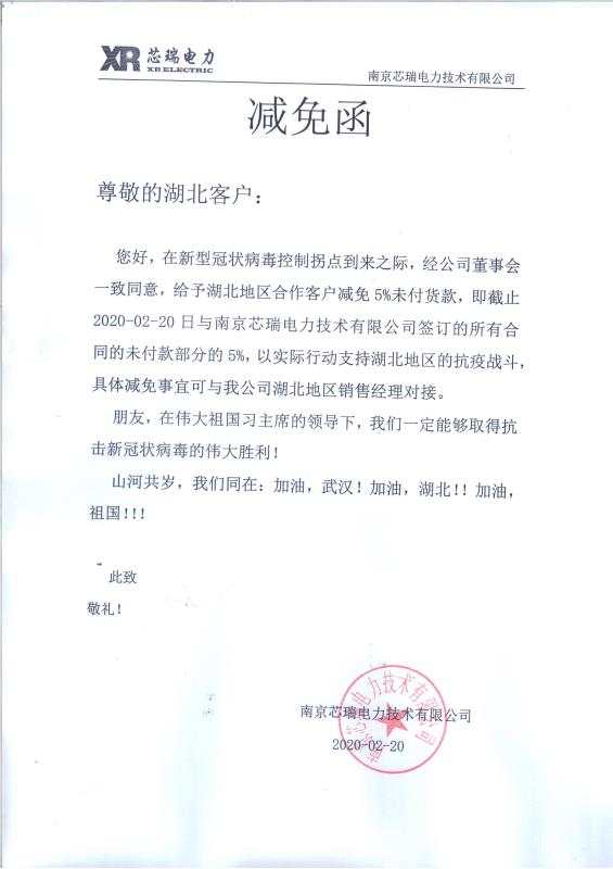 芯瑞电力公司在全面复工第一天及时召开董事会,向湖北客户发出《减免函》,决定减免湖北地区的合作客户的部分欠款,减免金额总计人民币83126元,积极支持湖北人民抗疫战斗,支持疫情结束后的经济建设,并号召电气行业支持湖北抗疫战役。同时,芯瑞电力公司举办买口罩一个捐赠2元公益金活动,累计捐赠福州进出口商会人民币4000元支持其举办公益活动。