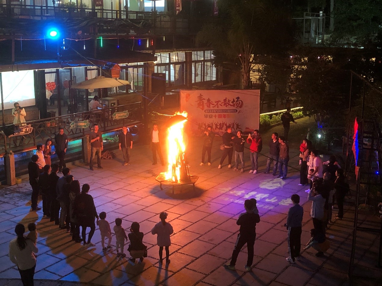 夜幕降临,用过晚餐后,广场上高燃篝火,热情激扬的晚会开始了。校友们一起欢歌笑语、尽情欢娱。大家跳起别具特色的云南舞,并分组展开紧张刺激的拔河比赛,大人小孩齐上阵,其乐融融。