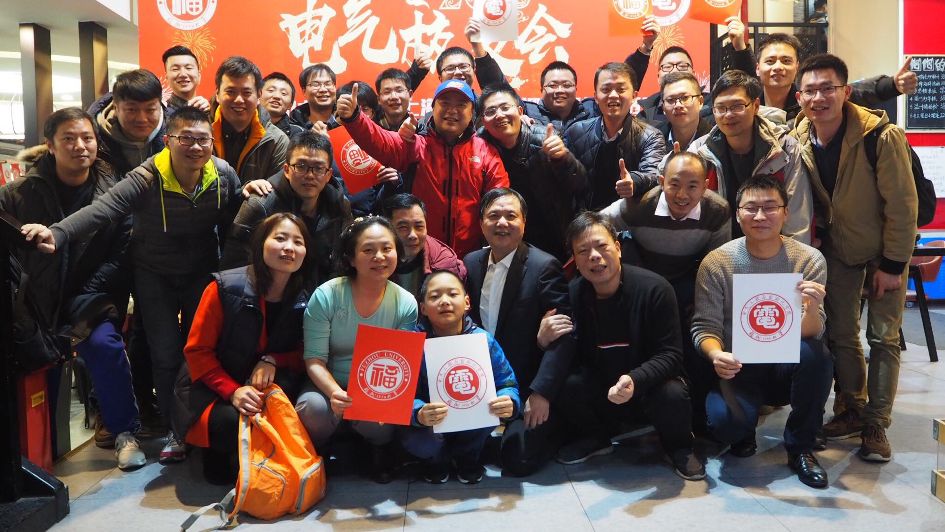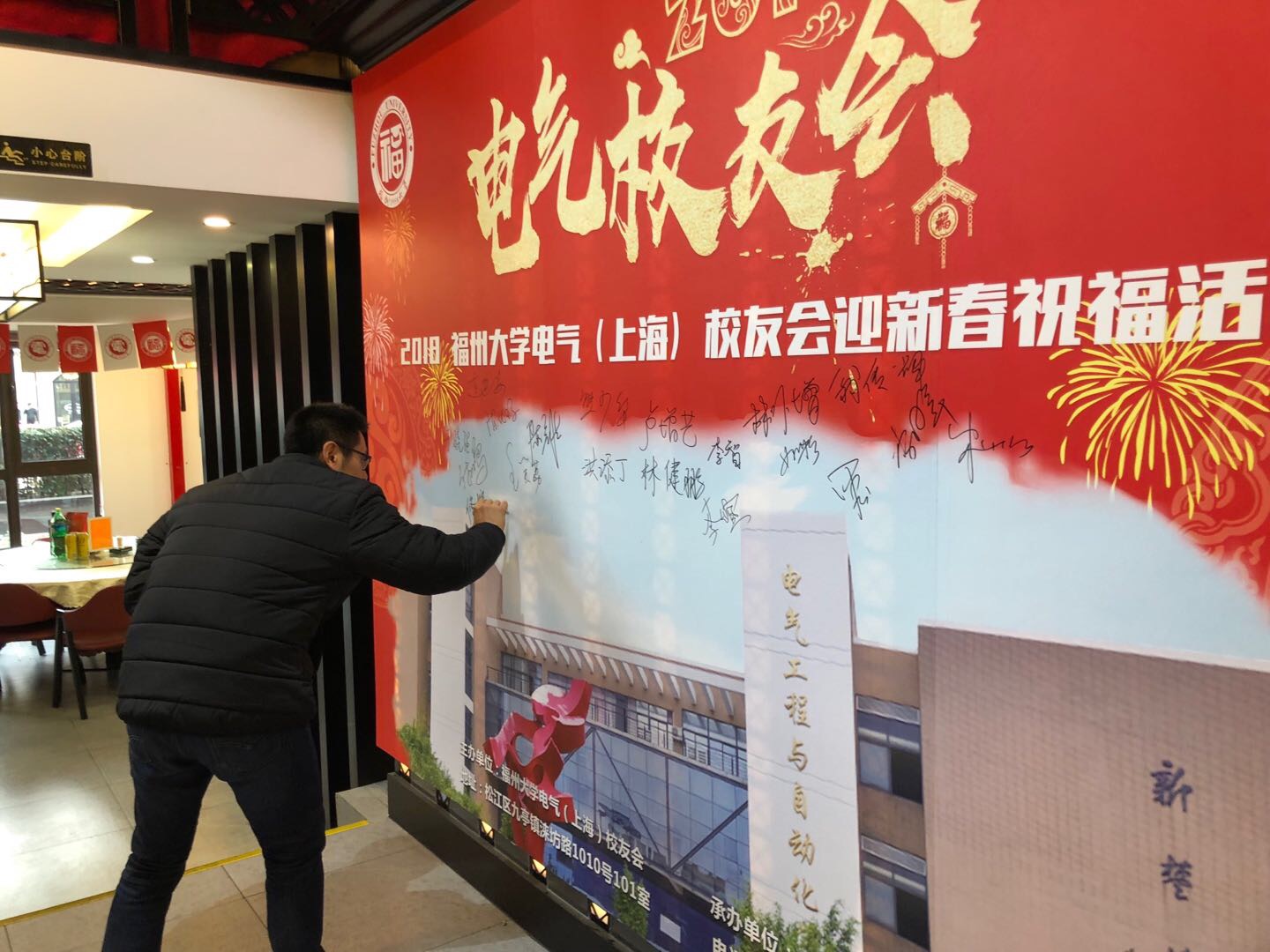 2018年1月6日,电气(上海)校友会在上海市松江区涞坊路1010深水海鲜餐厅举行聚会。38位校友在签到墙上留下了自己的大名,并合影留念。大家在精美的明信片上,给明年的自己写一封信,然后交由现场的“福二代”们用火漆封口。当明年校友们再次相聚时,大家将亲手拆开属于自己的信封,实现今明两年和自己的对话。校友们还举行了多项娱乐活动,热火朝天。最后,陈代琛会长的讲话把现场气氛推向了高潮。