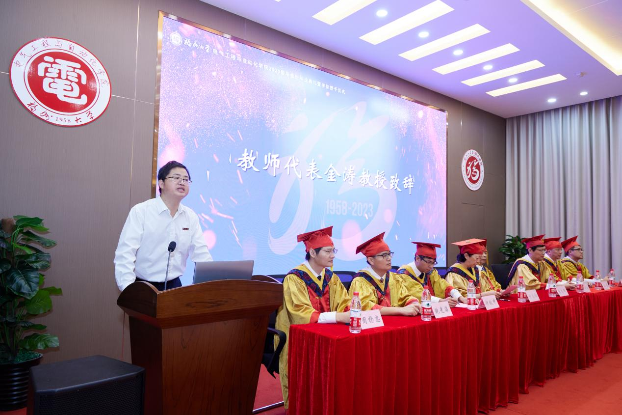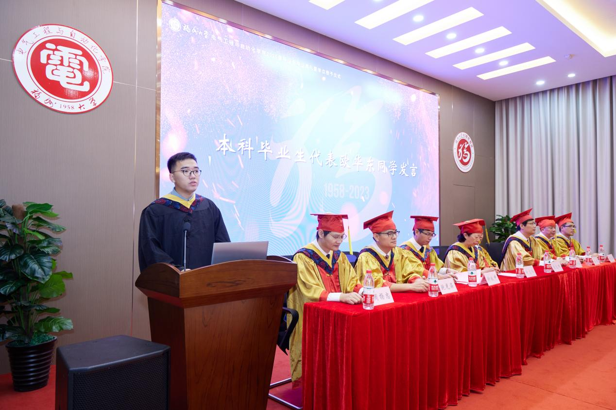 在福大65周年华诞之际,我们相聚于此,共同为母校庆生。2016年入学到今天举行毕业典礼,我愿称我们的本科是“七年制”Pro·max版,自建校65周年以来应该是独一无二的,体验了别人没有的超长学习、实践时长。前四年,我们在福大电气打基础、学本领;后三年,有的同学是继续在校钻研理论知识,有的同学则是奔赴岗位磨炼实践能力,最后汇聚在此交流我们七年来的学习成果。可以说,我们独有的经历,注定了我们这届终将与众不同。