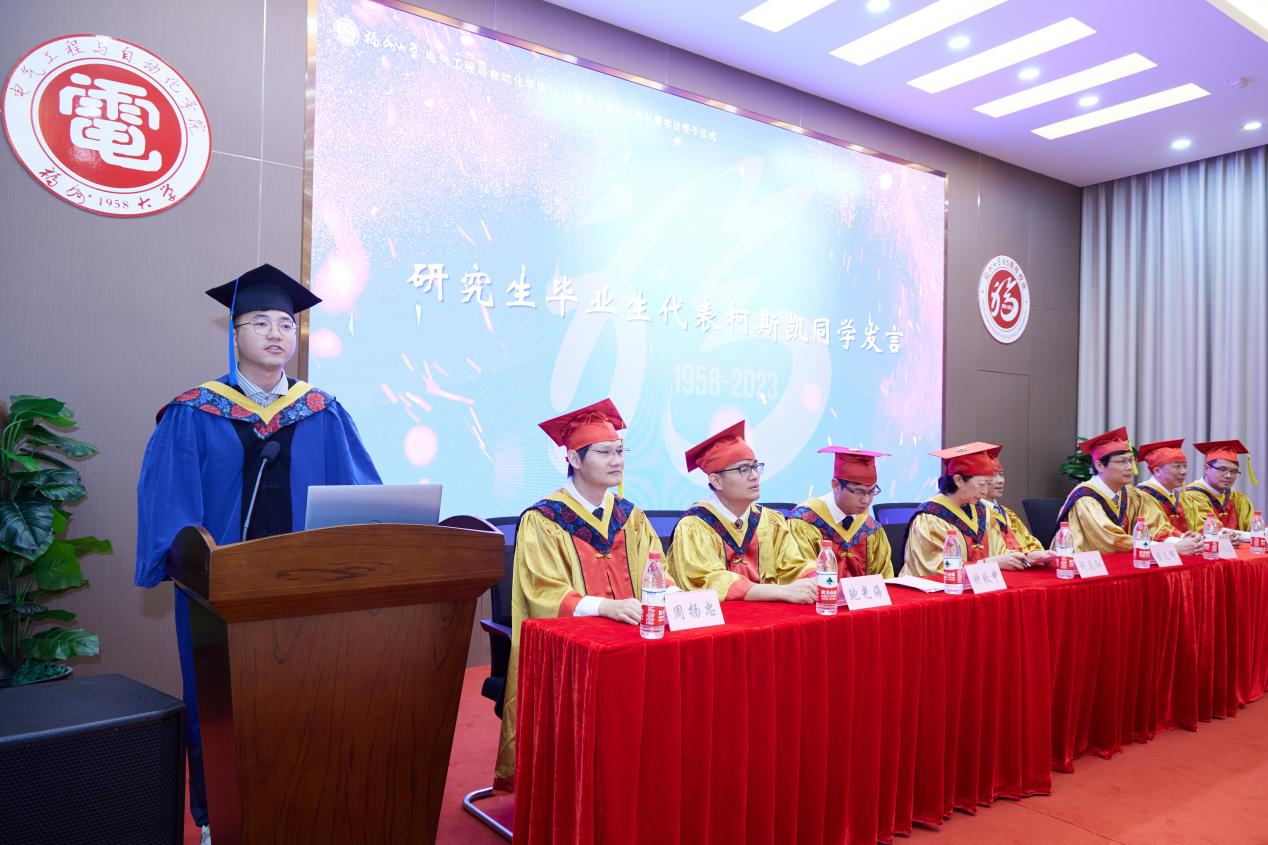 我是电气研究生院2020届毕业生柯斯凯,毕业三年多,今天又见到了很多熟悉的面孔,感慨万千。所以今天能作为毕业生代表在典礼上发言,我感到十分荣幸。