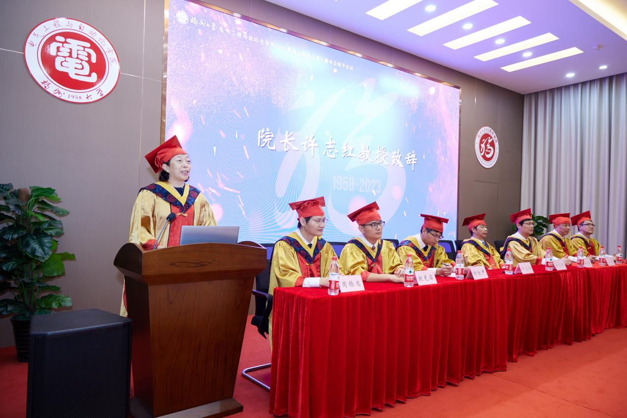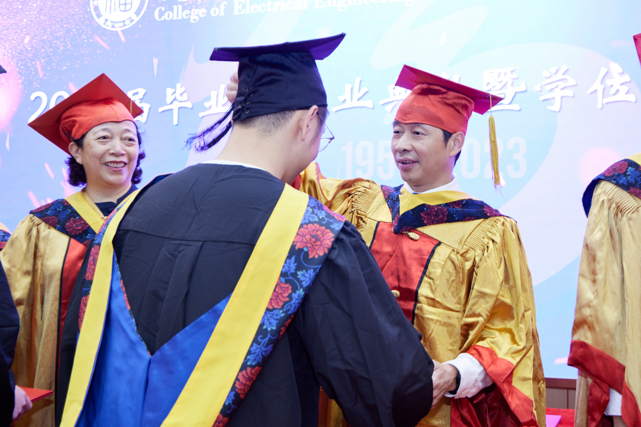 许志红院长代表学院对来参加这场特殊毕业典礼的同学们表示了欢迎,同学们从四面八方返校,是对自己学业生涯画上句号,更是对母校的一片深情。许志红院长对同学们提了几点希望:一是希望同学们永葆内心的求知欲,在实践中锤炼本领、创造新知,在连续性学习中实现自我提升,通过终身学习去迎接人生的挑战;二是希望同学们要始终与祖国心连心、同呼吸、共命运。青年有理想国家有希望,追逐梦想要与时代同向同行,个人梦要主动融入国家梦;三是希望同学们要立大志、做栋梁,能吃苦、肯奋斗,懂感恩、有大爱,今后无论走到哪里,都要发扬电气人“顶天立地”的精气神,写好人生新篇章。
