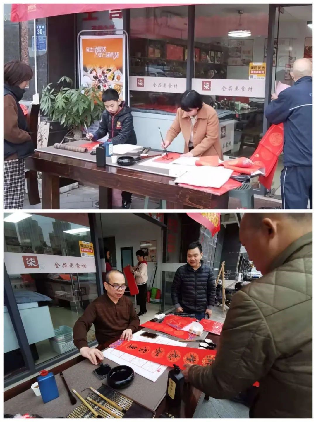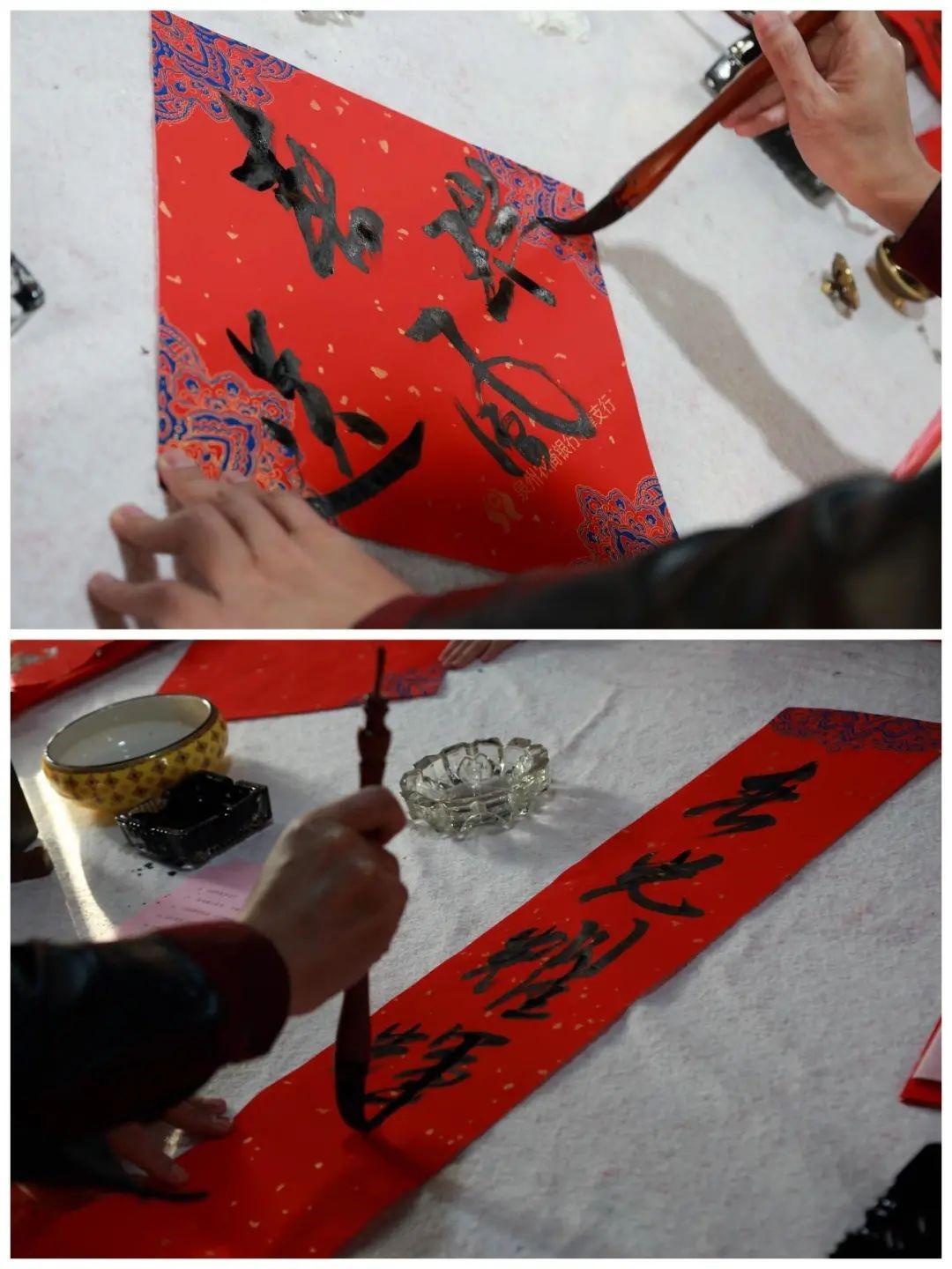 ”为题,在各校友群里开展了好联佳句征集活动。校友们踊跃参与,精彩联句层出不穷。活动开始之后,部分擅长书法的校友及校友家属到场为校友义务书写赠送春联。既有小朋友们工工整整的“爆竹冲天去报喜,飞花入门来贺年”,又有豆蔻年华的年轻人写下的“万里春华开锦绣,九州龙虎会风云”、“瑞日芝兰光甲弟,春风棠棣振家声”,更有校友们自创的“福天福地福人间,大国大家大中华”、“福光普照大家乐,泉水均滋校友欢”、“明德至诚有福之州,博学远志满街圣人”……执笔者或一笔一划、颜筋柳骨,或风华正茂、矫或惊龙,或行云流水、铁书银钩,浓浓的春意在笔尖绽放,深深的祝福在纸上流淌。草书、行书、隶书、魏碑、行楷,泼墨造物、妙笔生花,一个个“福”字、一幅幅春联源源不断地被悬挂起来。观者一边读着联句细细品味,一边对精妙的书法赞不绝口,纷纷掏出手机拍摄作品或与作品合影留念。