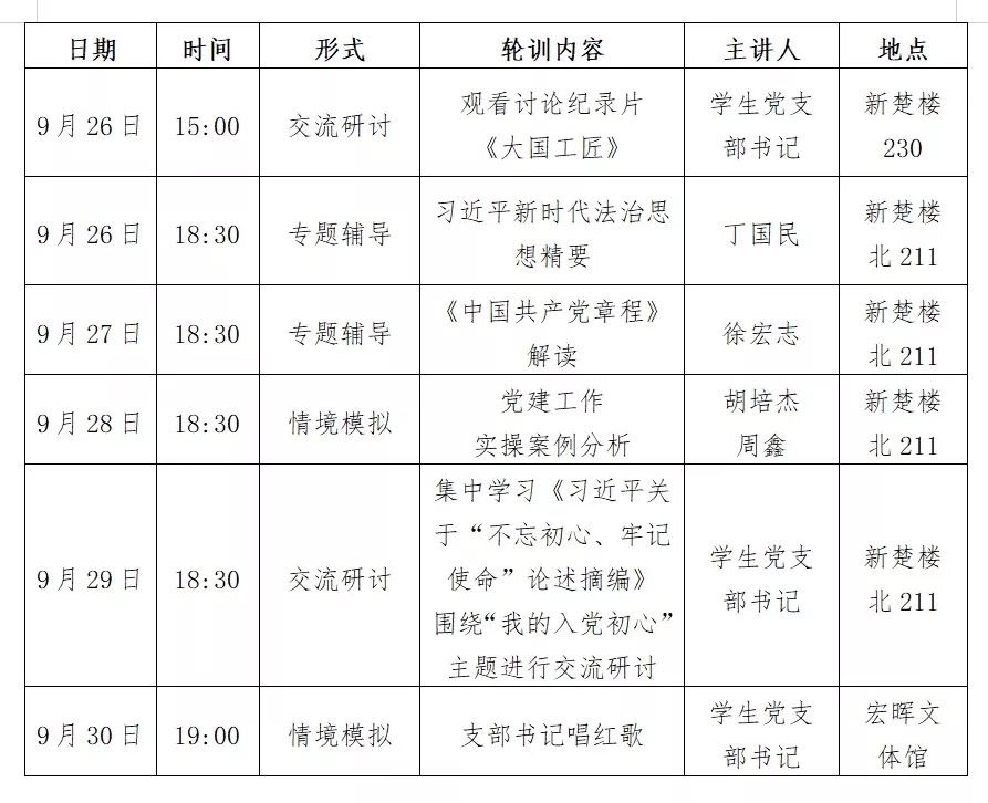 根据学校《关于开展党支部书记集中轮训的通知》的要求,结合实际工作需求,在2019年9月26日至9月30日期间组织了学院学生党支部书记集中轮训工作。时间安排如下: