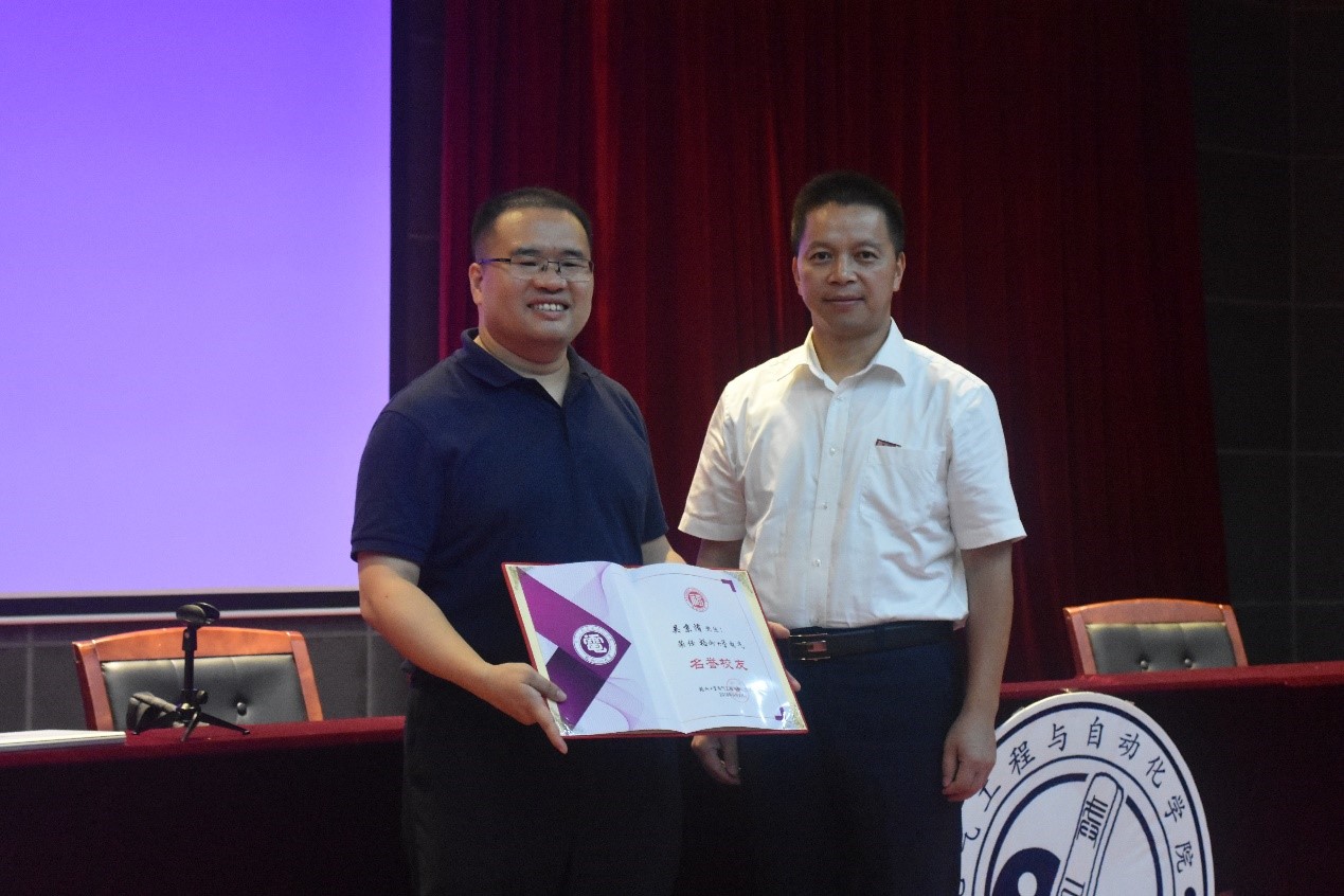 党委副书记黄国辉老师为吴京洧学长颁发荣誉校友证书,并为学长送上学弟学妹准备的小礼物,吴京洧学长也与黄国辉老师亲切握手,并与大家合影留念。感谢本次学长给电气学子们带来一场宝贵的讲座。