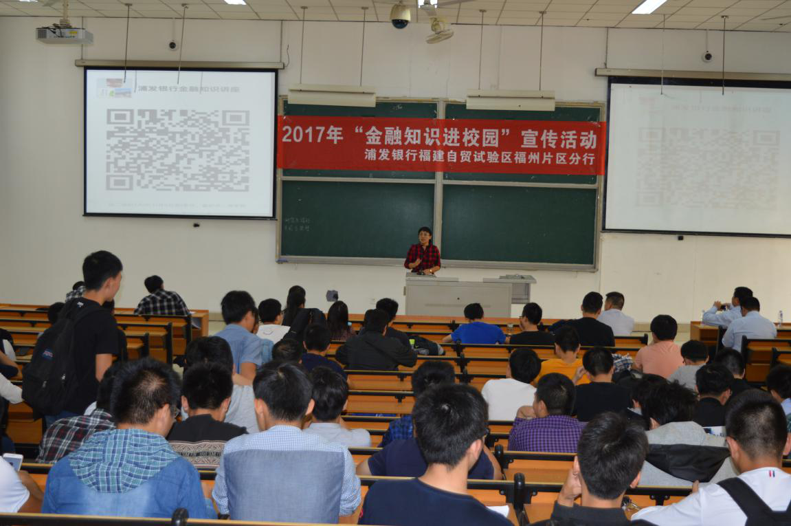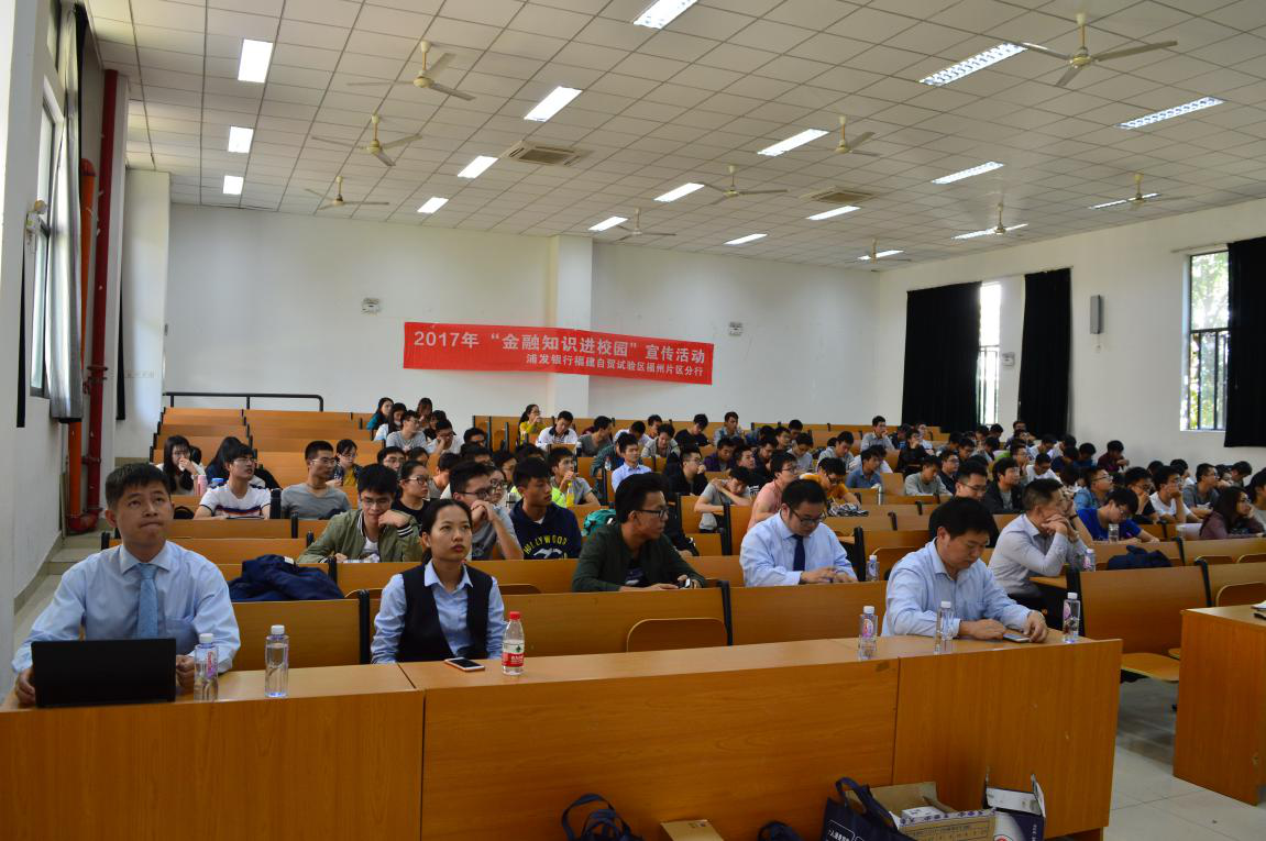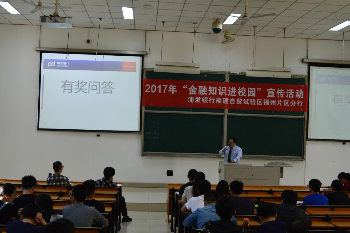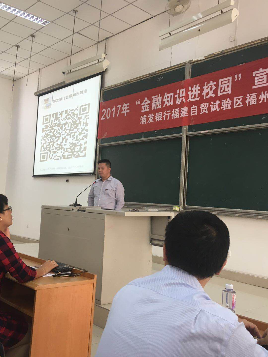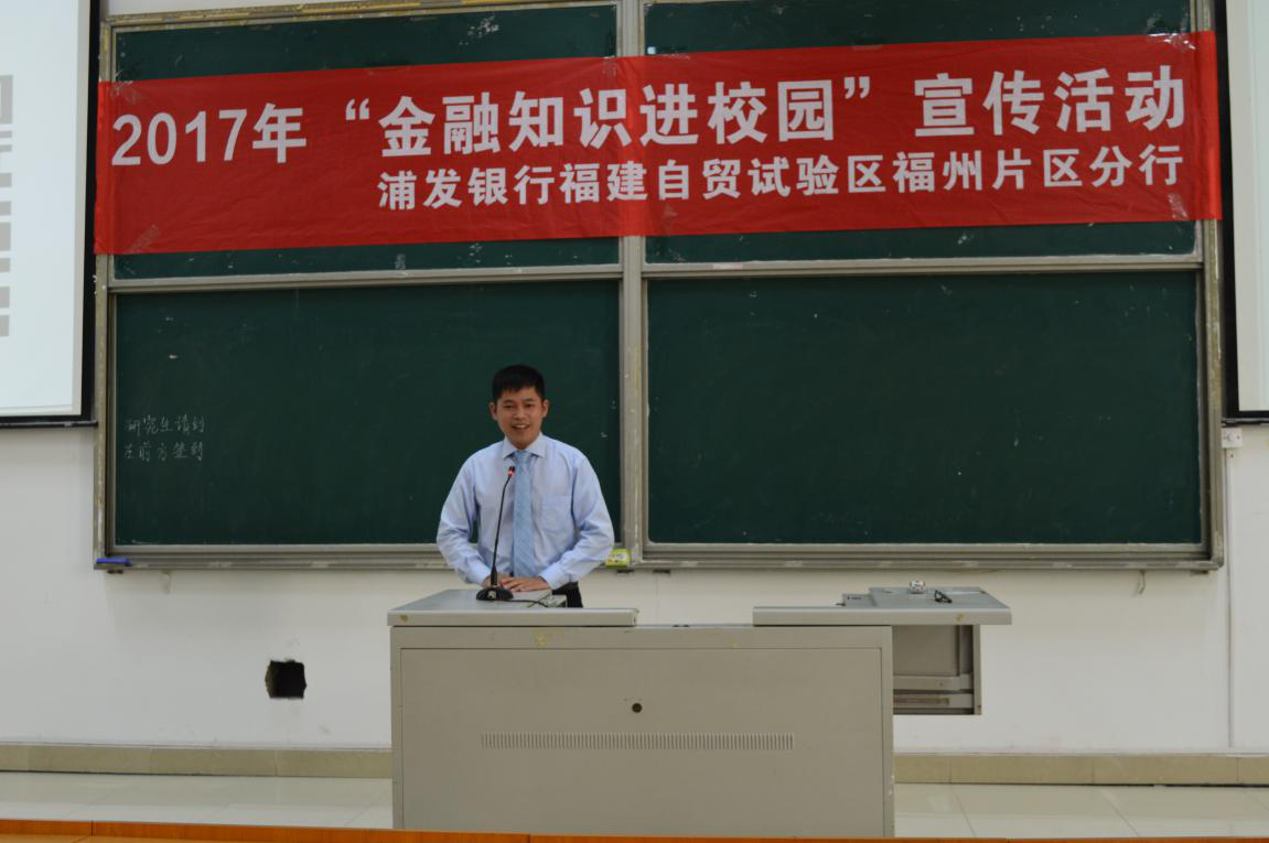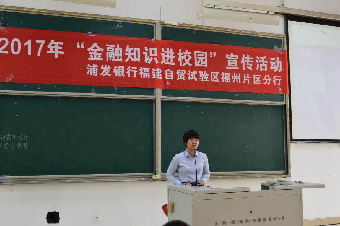 请来了浦发银行福建自贸试验区福州片区分行的行助和内训师,在2017年11月2日下午举办了“金融知识进校园”讲座,讲座由研究生辅导员许海燕老师主持,院党委副书记黄国辉老师出席讲座。