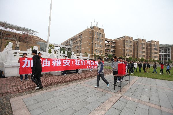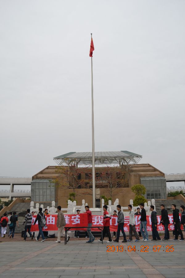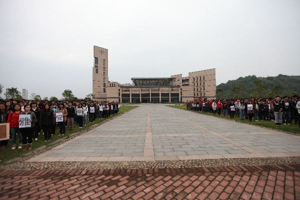 天空低垂,全场师生为在雅安地震中遇难的同胞默哀,同学们手托“雅安平安,中国加油!”的牌子低头为灾区人民祈福。默哀完毕,在全体师生的注目礼和雄壮的国歌声中,麻豆社