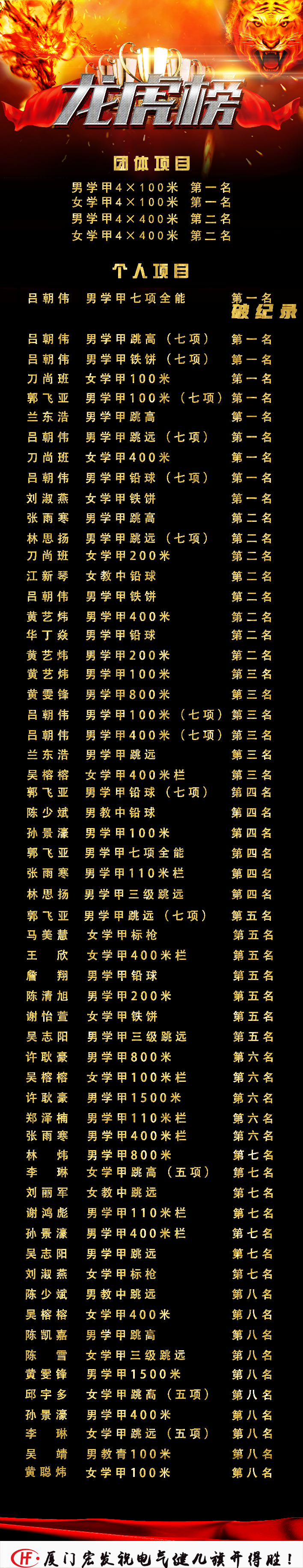 战功赫赫,继第49届勇夺桂冠后,于本届(第50届)蝉联冠军,获得团体总分第一、男学甲第一、女学甲第四、群体振奋杯第一及体育道德风尚奖的好成绩!同时再次感谢厦门宏发电声股份有限公司对麻豆社