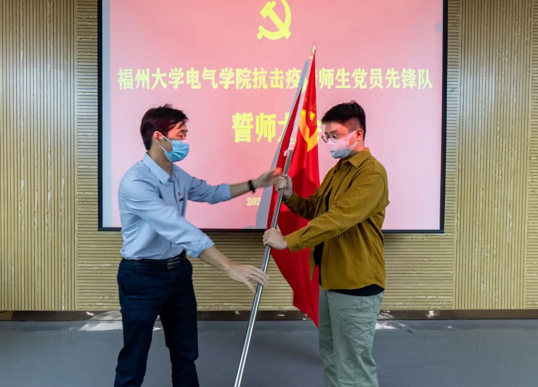 最后,潘志辉书记为党员先锋队授党旗,先锋队开赴疫情防控和保障线上教学质量的第一线。