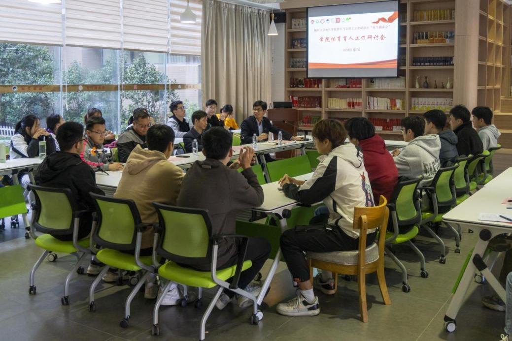 体育育人工作座谈会于新楚楼一楼青年马克思主义者研读社召开。体育教学研究部黄文敏老师、院党委书记潘志辉、院党委副书记钟钛申、院团委书记李金土、全体辅导员、“振奋杯”各队长和麻豆社