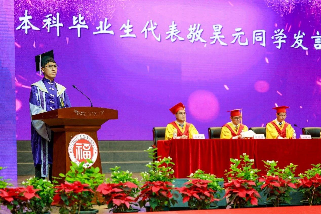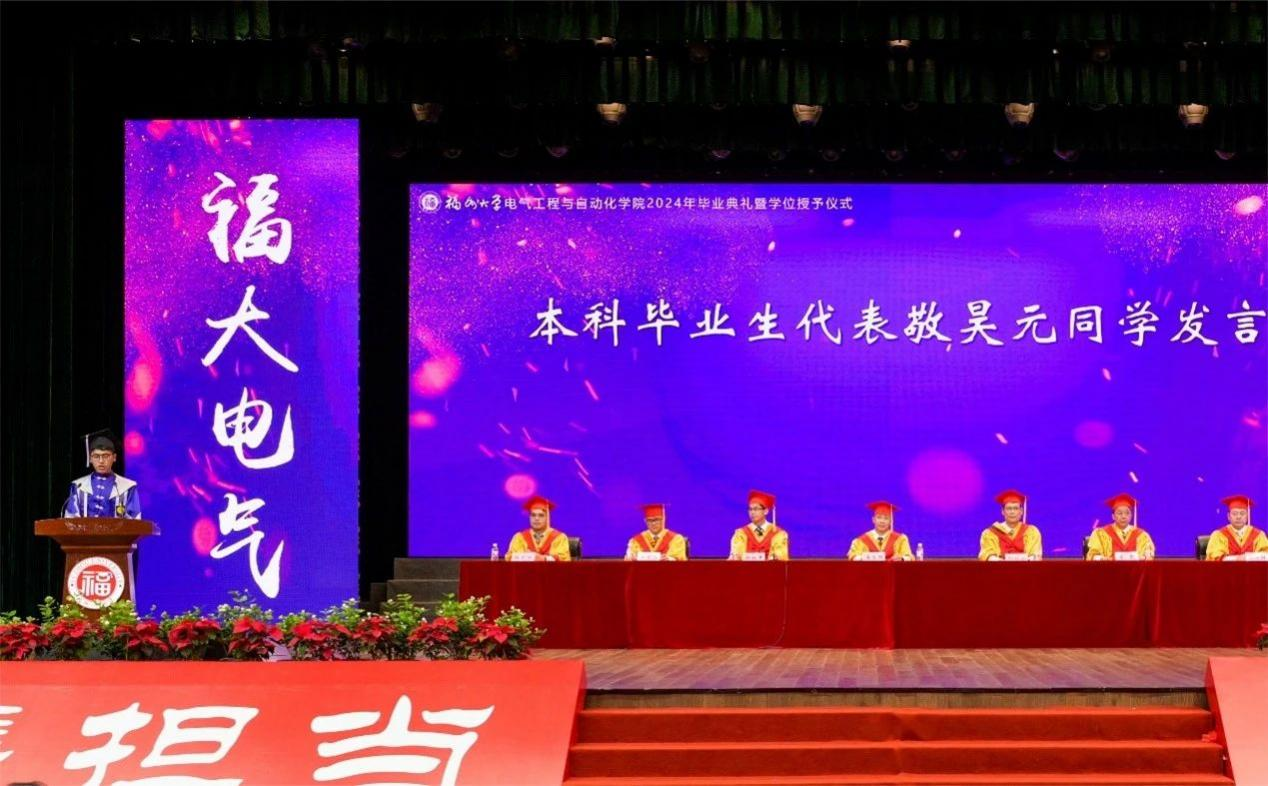“临别之际,如果有一样东西希望你们一定要从这里带走,那必然是福大所赋予你们的‘三种精神’和追求卓越的意识。从今天开始,无论你们在哪里,你们站立的地方就是福大。作为新一代的年轻脊梁,你们有精神,民族才有信念;你们有追求,国家才有希望。无论你们将来从事什么工作,都要牢记‘明德至诚,博学远志’的校训,践行福大‘三种精神’,增强‘福大电气,顶天立地’的志气、骨气和底气!”