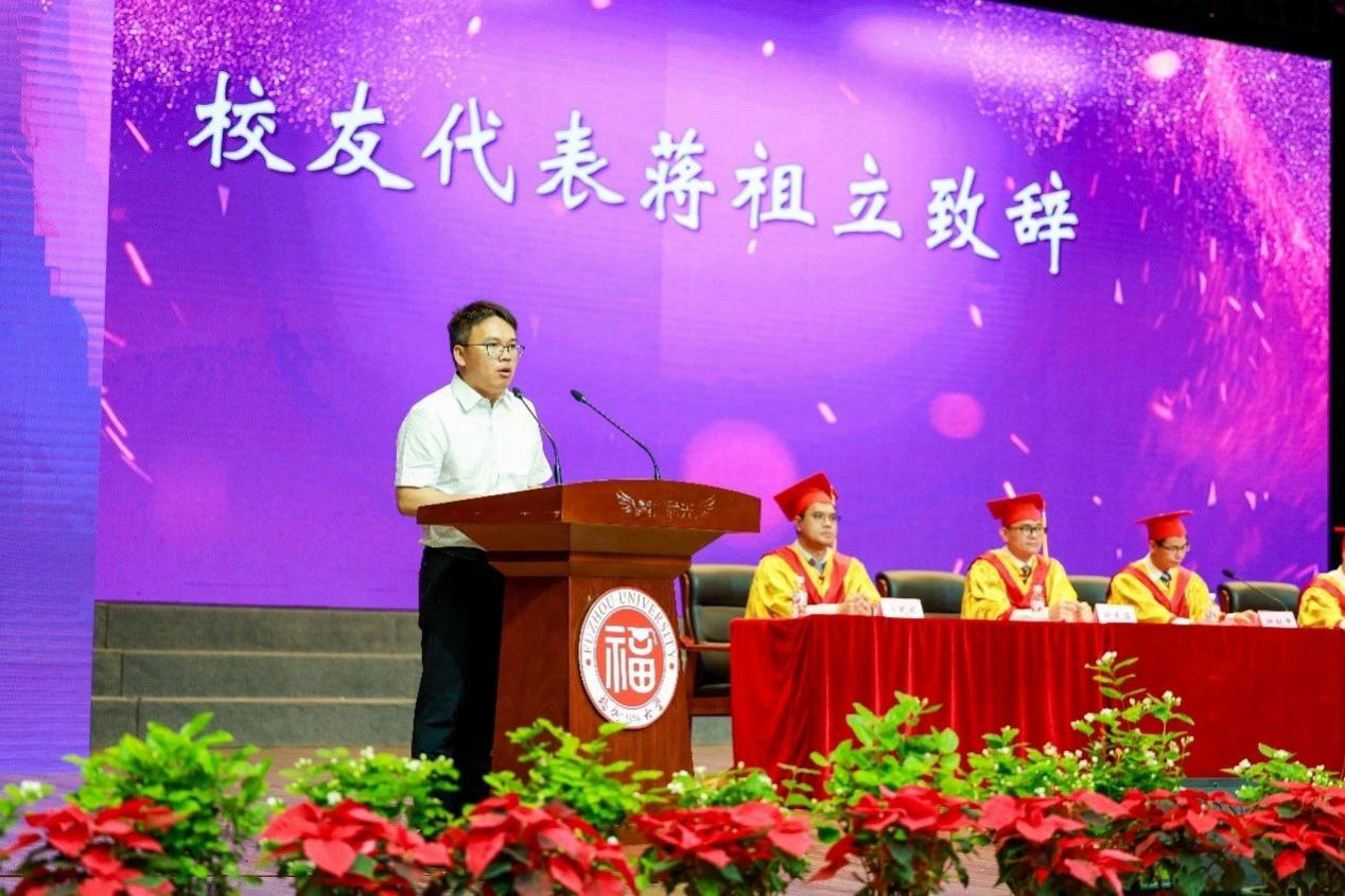校友代表蒋祖立致辞,作为校友代表,他怀着殷切期望,启迪我们如何在自己的岗位上放飞青春梦想。他提出三个关键词:坚持、创新、担当。愿毕业生们发扬工匠精神,书写属于新时代的篇章。