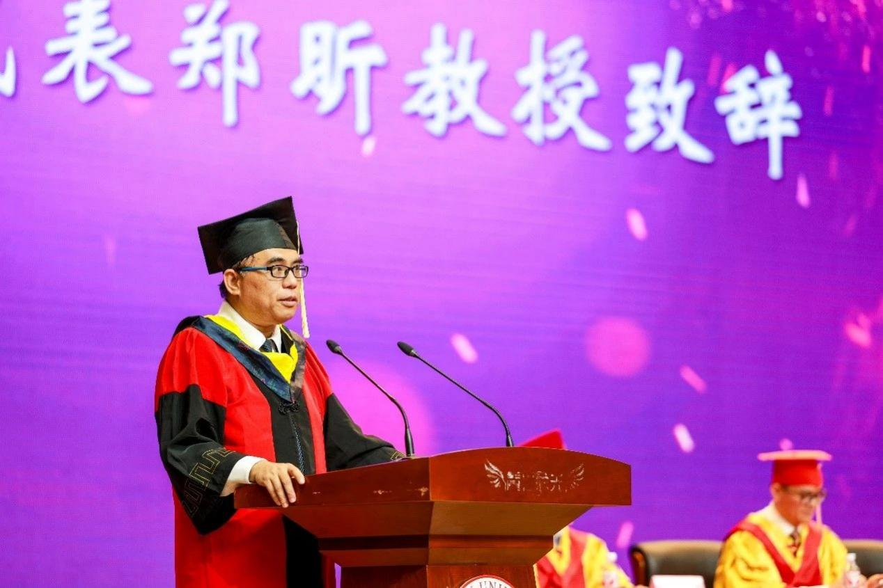 郑昕教授,作为教师代表,他见证着同学们成长成才,也见证着他们人生历程中最重大的一次飞跃。在毕业生们即将扬帆起航之际,他期望同学们从容面对生活中的困难与挫折,始终保持善良的品性,道远且长,行则将至,行而不辍,未来可期。