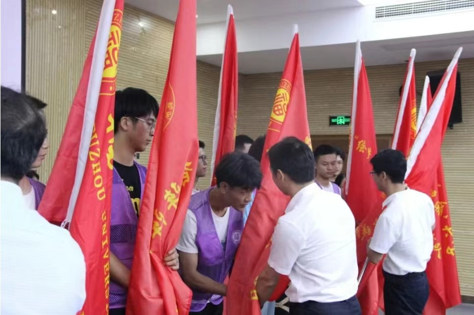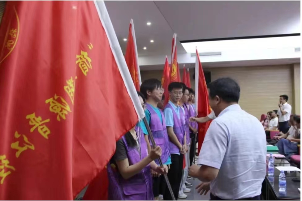 院党委书记潘志辉老师、院党委副书记钟钛申老师和副院长王武教授为学院2024年暑期“三下乡”社会实践15支重点队伍学生代表授旗。红旗飘飘,扬帆起航,朝向党和人民需要的地方进发,预祝本次暑期“三下乡”社会实践圆满成功!