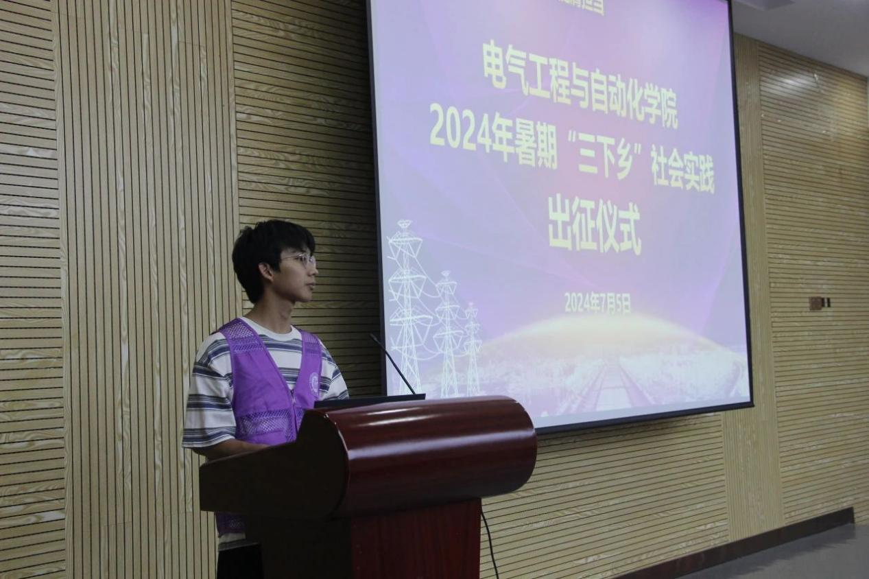 吴靖同学是学院“强化共同体意识,共筑民族复兴梦”院级重点实践队的队长。他认为,暑期“三下乡”社会实践是青年学生了解国情、社情、民情的重要载体,是青年学生受教育、学知识、做贡献的主要渠道。同时,他提出了三点感受与大家共勉:一是要自信自强,坚定不移跟党走好中国道路;二是要担当奋斗,以实际行动传承弘扬电气精神;三是要团结一心,同当地群众一道凝聚起强大社会力量。最后,他预祝每位同学都能在接下来的实践中有所收获;在这堂与现实相结合的“大思政课”中“受教育、长才干、做贡献”,奋力书写为中国式现代化挺膺担当的青春篇章。
