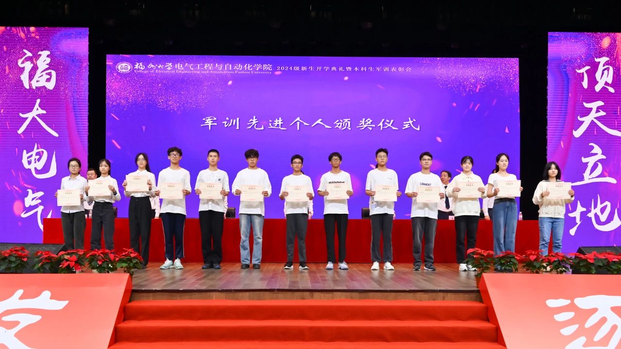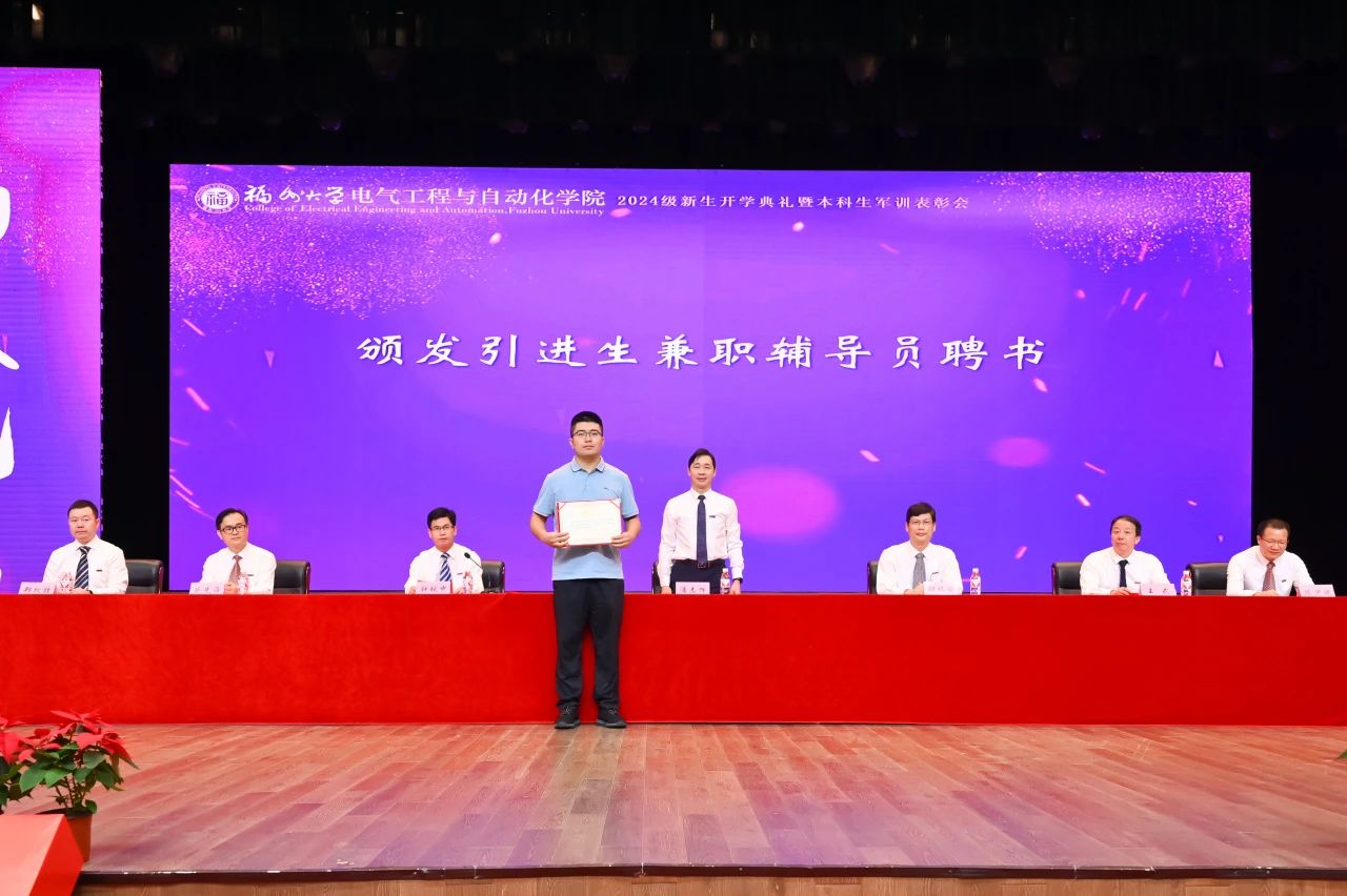 2024级新生开学典礼暨本科生军训表彰会在宏晖文体综合馆隆重举行。出席本次典礼的领导嘉宾有院党委潘志辉书记,负责学院行政工作副院长邵振国教授,院党委钟钛申副书记,副院长王武教授,院长助理鲍光海教授、郑跃胜教授,院党委委员、工会主席、自动化系党支部书记陈少斌副教授,出席典礼的还有各系主任、系支部书记、教师代表、引进生兼职辅导员、新生班主任、各年级辅导员以及全体2024级新生。典礼由院党委副书记钟钛申主持。