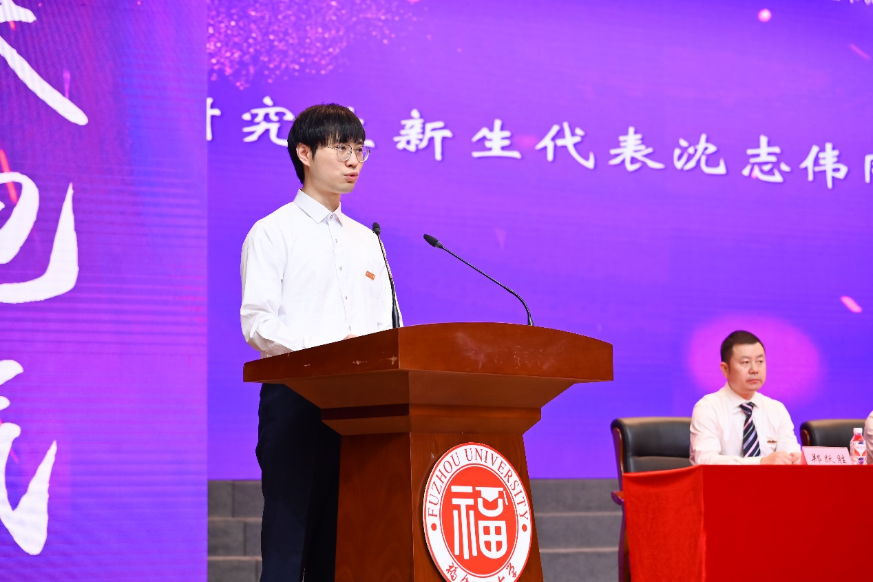 本科生新生代表孙微茵同学代表新生向师长和亲友表达感谢,并分享了自己坚毅扎实的成长历程。孙微茵提到,在福大她不仅感受到了学院的温暖,还通过担任年级长等职务获得了成长。她表示,作为新时代“电气人”,不仅要学习知识、增长本领,还要传承“福大电气,顶天立地”的精神,与时代同频共振,成为爱国奉献、追求卓越的新时代青年,共同为学院和学校争取荣誉,创造辉煌。