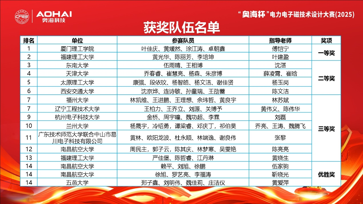 接下来,主办方代表中国电源学会磁技术专委会主任委员太原理工大学杨玉岗教授公布了本次决赛的获奖情况,经过激烈角逐,厦门理工学院、福建理工大学队伍斩获一等奖,东南大学、天津大学、太原理工大学、西安交通大学队伍获得二等奖,麻豆社