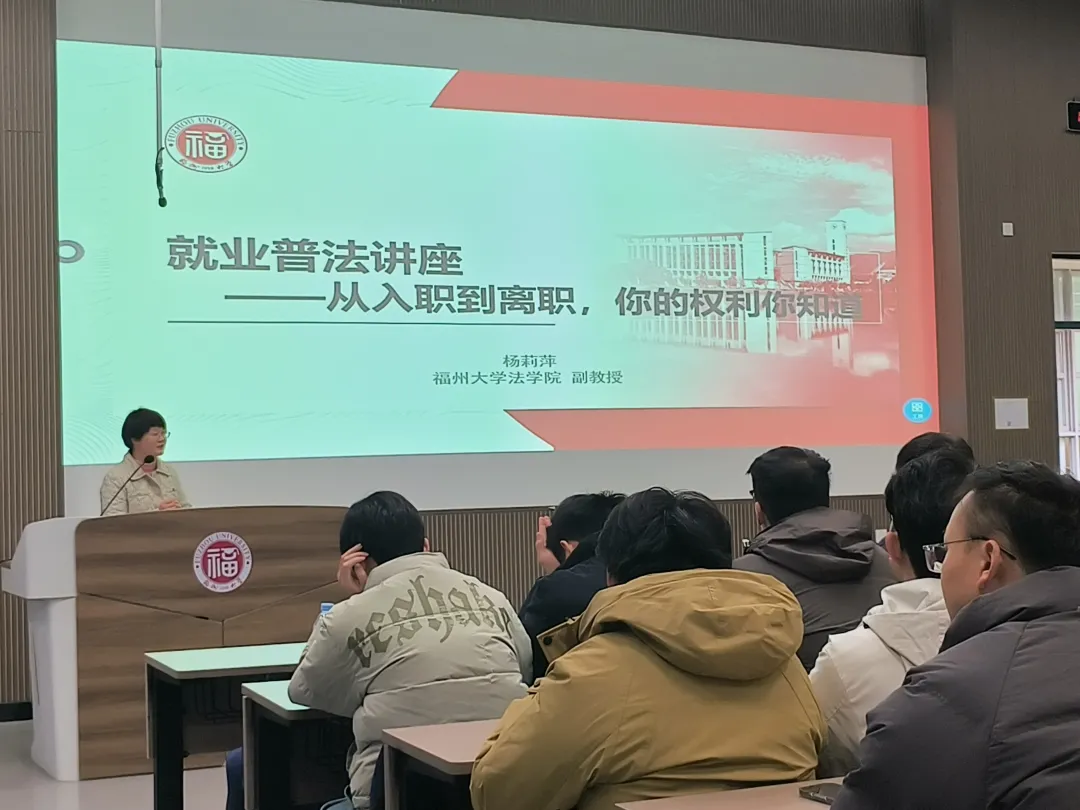 杨莉萍副教授分别从“开篇——职场有风险,普法须先行”、“迈好第一步:入职环节的法律风险防范”、“稳定与发展:在职期间的权益保障”、“好聚好散:离职环节的权益清算”、“聚焦当下:新型用工模式与争议热点”、“维权指南:权利被侵犯后的救济途径”六大方面为学院毕业生详细讲述了职场中的一些陷阱以及遇到争议时如何解决,提出了“灵魂三问”:1、你签劳动合同了吗?指出入职不是简单的“签合同、办手续”,而是明确双方权利义务的关键起点,要警惕隐藏的“职场陷阱”;2、公司能随意调整你的岗位和薪资吗?指出在职期间是劳动者履行义务、获取回报的主要阶段,需重点关注劳动报酬获取、休息权利、安全保障等;3、离职时,你的经济补偿金算对了吗?指出无论是“主动辞职”还是“被动解除”,都需依照法定程序,避免因流程不当损失应得权益。