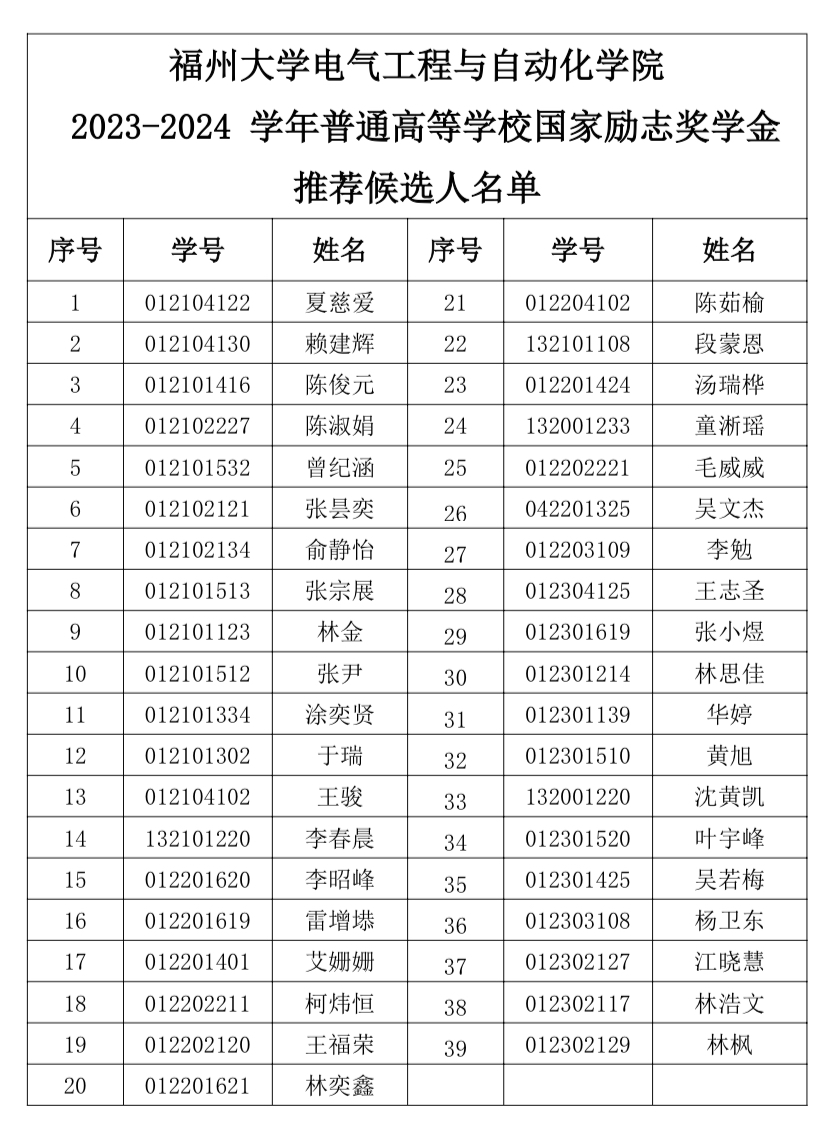 根据麻豆社 《关于做好 2023-2024 学年本科生国家励志奖学金》文件要求,经同学申请,学院资格审核,并经学院国家励志奖学金评审委员会评审。现学院国家励志奖学金评审委员会决定推荐李昭峰等 39 名同学参与麻豆社 2023-2024 学年“普通高等学校国家励志奖学金”评定。现将推荐候选人名单公示如下,公示时间为 2024 年 9 月 23日-2024 年 9 月 26 日,在此期间若对上述名单存有异议,请及时予以反馈。