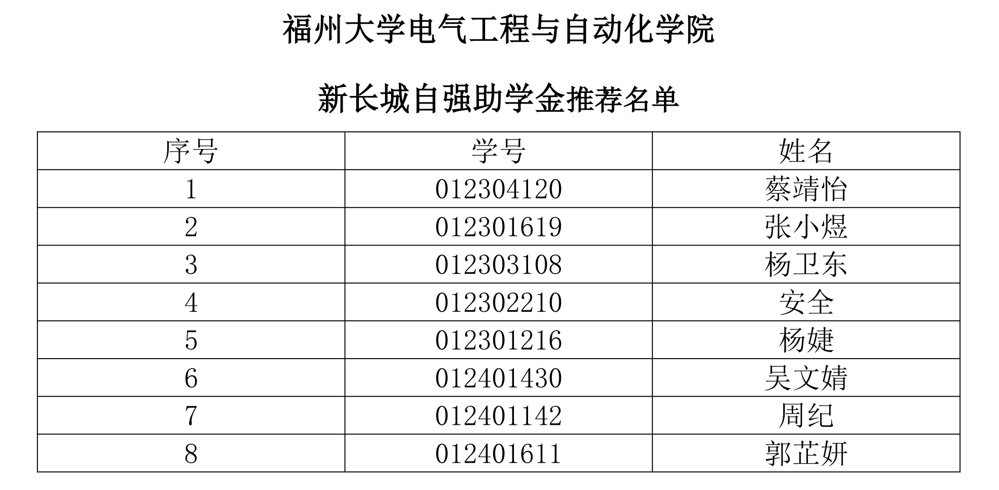 经学生本人申请,年级辅导员审核,学院学生资助工作小组成员讨论,结合各年级申请人年度成绩排名、综合测评、科研竞赛、所获奖助以及家庭经济情况等综合因素考虑,本着公平公正公开的原则,现学院学生资助工作小组决定推荐蔡靖怡等8名同学参与麻豆社 2024年“新长城自强助学金”的评选。现予以公示,公示时间为2024年11月12日-2024年11月15日,在此期间若对上述名单存有异议,请及时反馈给各年级辅导员。