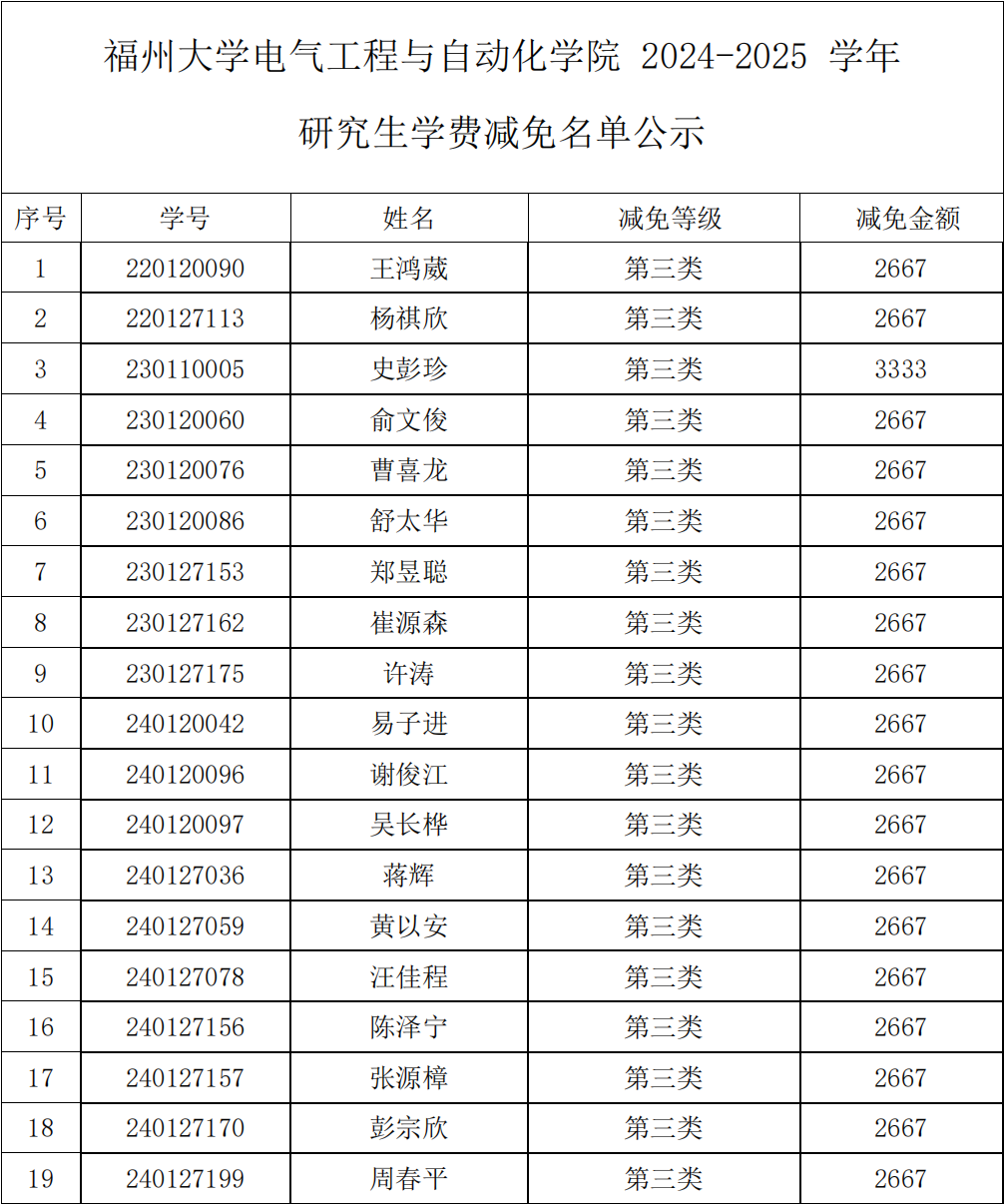 根据《关于做好2024-2025学年家庭经济困难研究生学费减免工作的通知》文件精神,经同学申请,学院资格审核,本着公平公正的原则,学院拟确定王鸿葳等19名同学为麻豆社 2024-2025学年学费减免候选人,具体名单见下表。现予以公示,公示时间为2024年12月5日-2024年12月7日,如有疑义,请在公示期内工作时间向麻豆社 学工组反映,电话:0591-22866584。