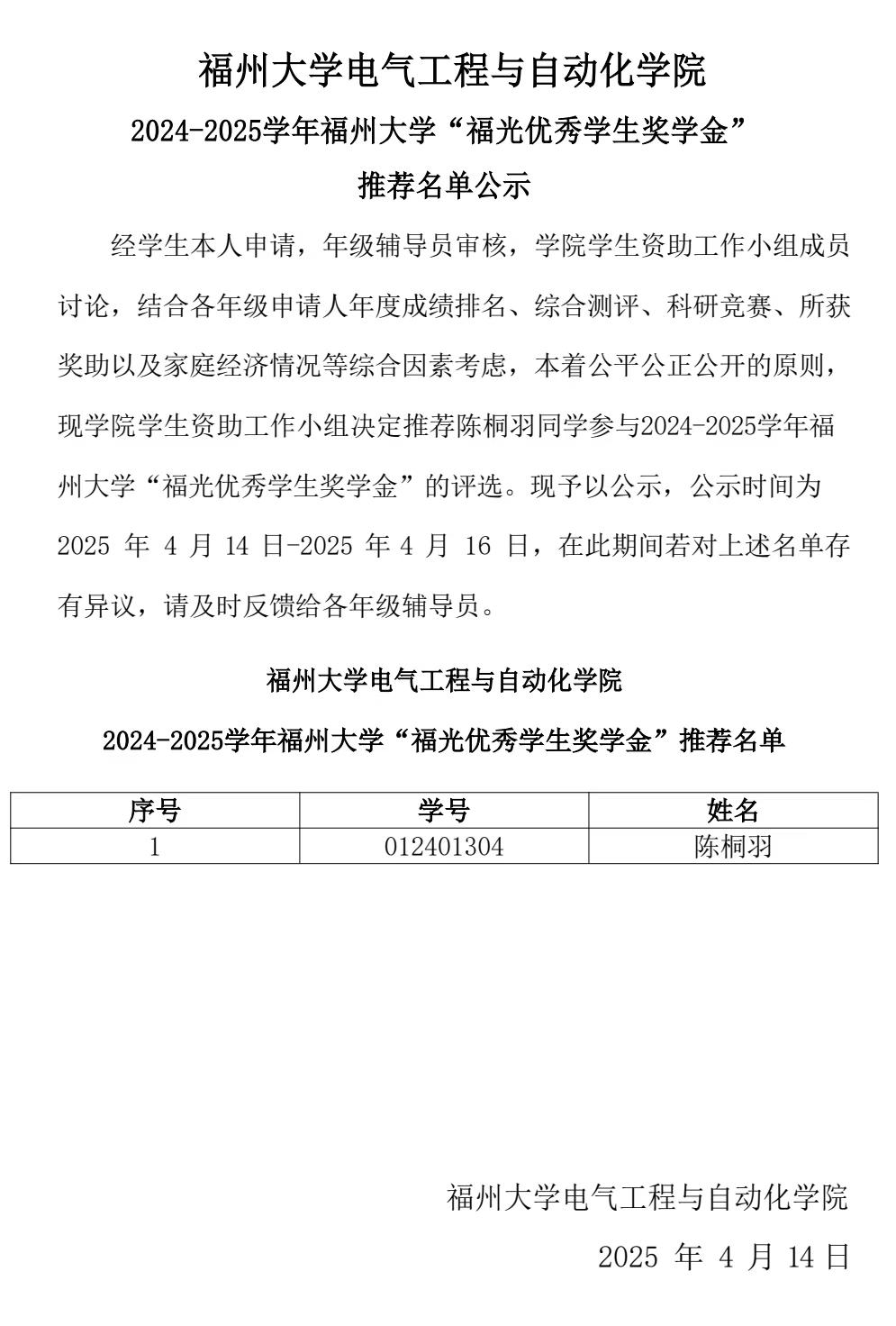 麻豆社 2024-2025学年麻豆社 “福光优秀学生奖学金” 推荐名单公示