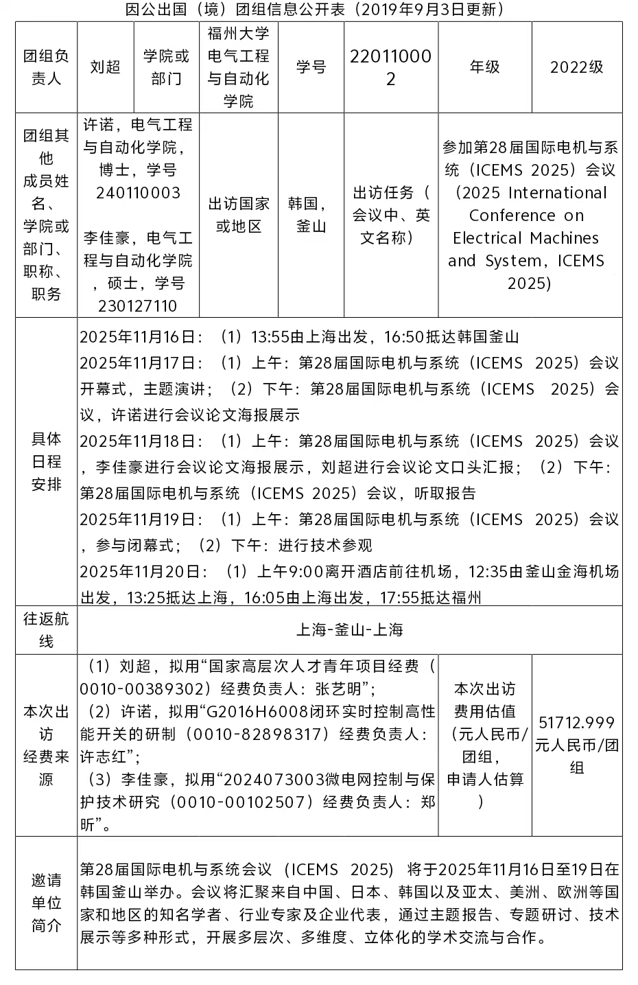 2023级电气工程专业硕士研究生,学号230127110。学院拟派刘超博士生、许诺博士生、李佳豪硕士生于2025年11月赴韩国釜山参加第28届国际电机与系统(ICEMS 2025)会议(2025 International Conference on Electrical Machines and System),现予以公示。公示时间从2025年10月29日起算,公示期为五个工作日。如有异议,敬请监督。联系电话:0591-22866584。