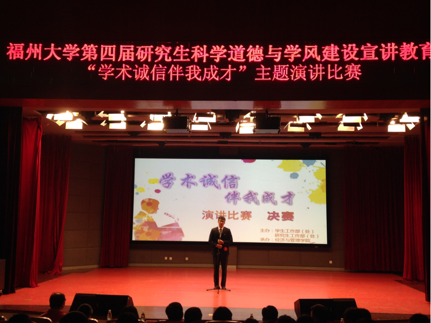 陶行知老先生说“千教万教教人求真,千学万学学做真人”。我们科研学习的出发点与落脚点正是一个“真”字,也就是学术诚信。倘若丢失了学术诚信,我们终日也不过碌碌无为;只有坚守学术诚信,才有可能取得令自己骄傲的学术成就。比赛开始后,在场的选手分别对学术诚信进行了引人入胜讲演,并由评委当场进行统计并公示分数。选手一一演讲结束后,由来自马克思主义学院的老师针对现场同学出现的问题进行了细致的点评。最后,由主持人公布了获奖名单,选手依次上台领奖。全场观众对获奖的同学都报以热烈的掌声。比赛结束后,获奖的同学上台与辅导老师、评委以及学院代表进行合影留念。