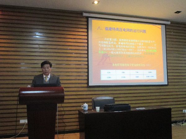 张孔林副院长多年来从事高压电网方面的工作,有着较强的理论基础以及十分丰富的现场经验。在报告会的开头,张孔林副院长十分周到的考虑到大家现场经验的不足,为大家提供了许多现场设备的图片,以供大家直观的了解常见的特高压设备,为后面的讲解打下了基础。接着,张副院长就电网的发展历史、点样的基础知识、特高压输电的优点、发展特高压电网所要注意的问题以及特高压输电设备等方面向我们做了生动而具体的介绍。紧接着,张副院长引出了不同阶段的特高压入闽工程。张副院长客观全面的向我们阐述了特高压技术的接入对福建省电网的影响,从一个技术人员的角度,面面俱到地向我们,理性分析了特高压技术的入闽对福建省各个方面的影响。