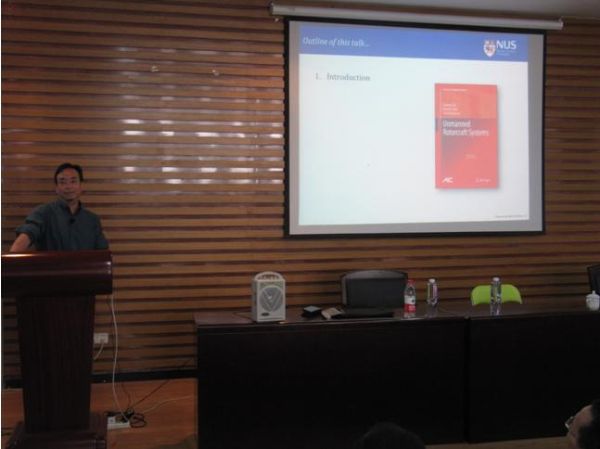 陈本美教授首先就自己近年来在无人机方面所做的工作进行了简要介绍,之后深入细致地分析了无人飞行器系统研究与开发的全过程。重点讲述了在研究无人机过程中所用到的软、硬件开发平台,并分析了自动飞行控制系统的信号处理、建模方面的相关细节。陈教授的报告内容丰富、思想深刻,其幽默风趣的讲话风格,不时引起场上阵阵热烈的掌声。