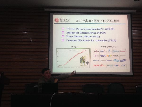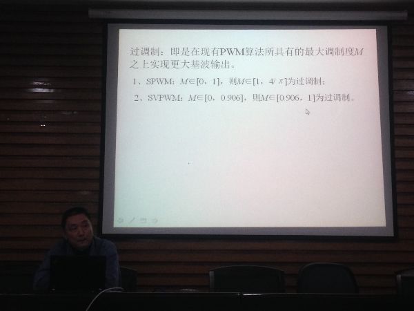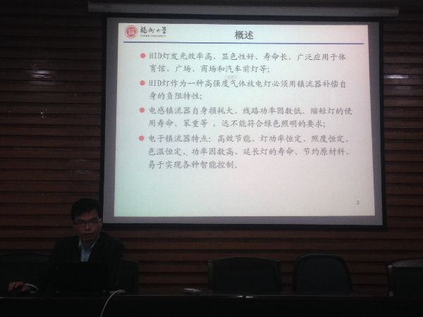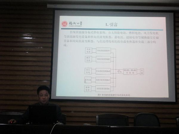 院长——陈为教授,他所作的报告题目是《无限电能传输(WPS)技术》,在比较了无线电能的传输方式的基础上,根据WPT对磁耦合系统的要求,提出了一种提高耦合系数的方法,并介绍了目前他的两个研究项目——电动汽车无线充电磁系统以及家用无线搅拌器;接下来是金涛教授,年轻帅气的他与大家一起分享了《电气设备的监控、智能输变电设备的工艺优化》;王榕生教授则对《基于优化的准正弦平顶调制波PWM过调制新技术》进行了讲解,他着重介绍了PWM过调制的算法以及谐波数值的分析,最后通过实验验证了理论分析的正确性;林维明教授做了关于《LED灯调光技术及其发展》的报告,通过介绍PWM调光以及线性调光的特点,得出组合调光策略更能发挥LED优良光学特性的结论;接着由林国庆教授详细的阐述了《HID灯声共振现象及抑制技术》;最后一个出场的是陈道炼教授,他就《全桥Boost多输入直流变换器型新能源分布式供电系统》与大家进行了交流。