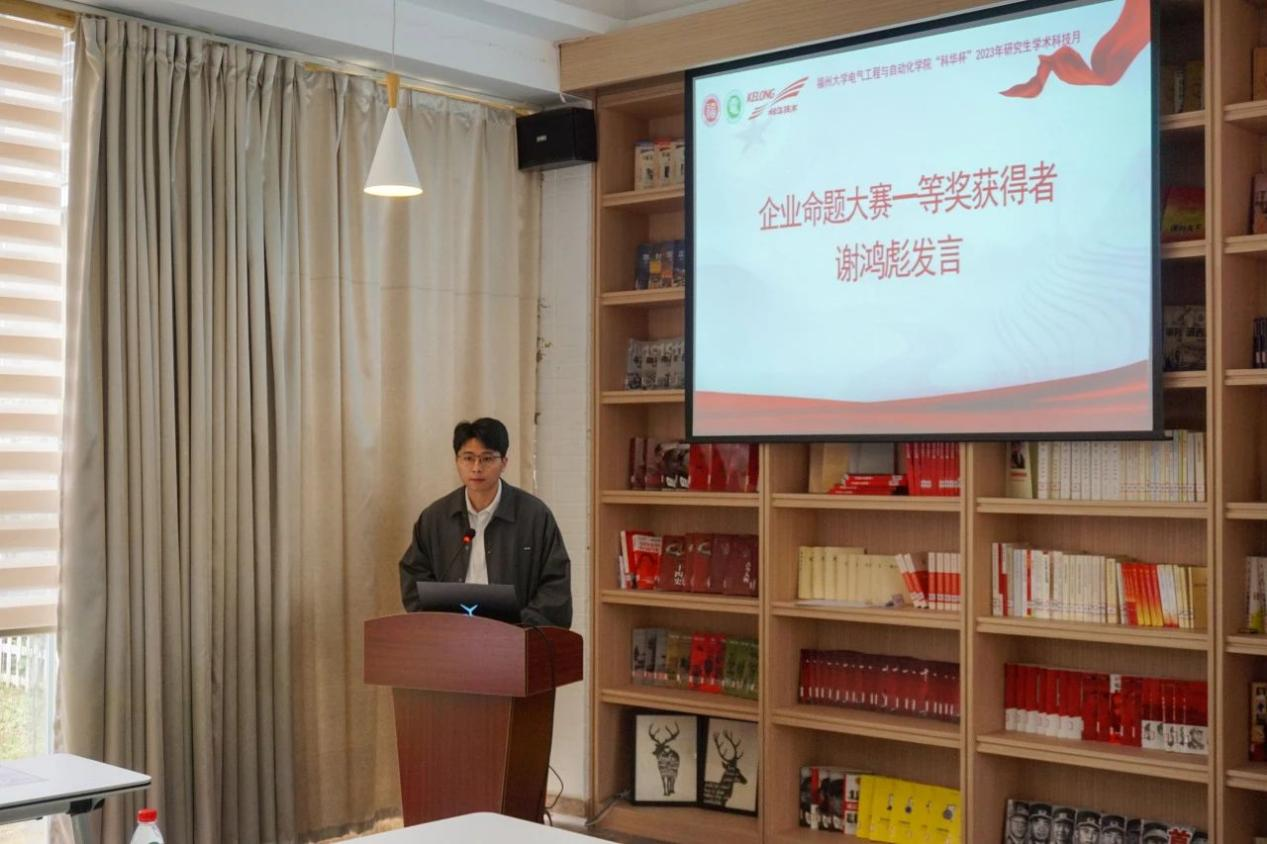 紧接着,企业命题大赛一等奖获得者谢鸿彪同学发表了获奖感言。他首先表达了对学院领导老师和科华数据股份有限公司的深深感谢,并鼓励同学们积极参与学术科技月活动,将科研成果转化为实际应用,回馈社会。谢鸿彪同学还分享了参赛经历和收获,表示将继续努力,再创新高。最后,谢鸿彪同学希望同学们要用创新思维解决行业难题,将科研成果应用于实际,推动行业乃至整个社会的发展。