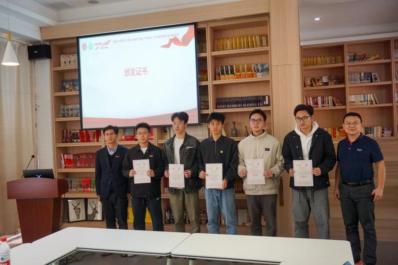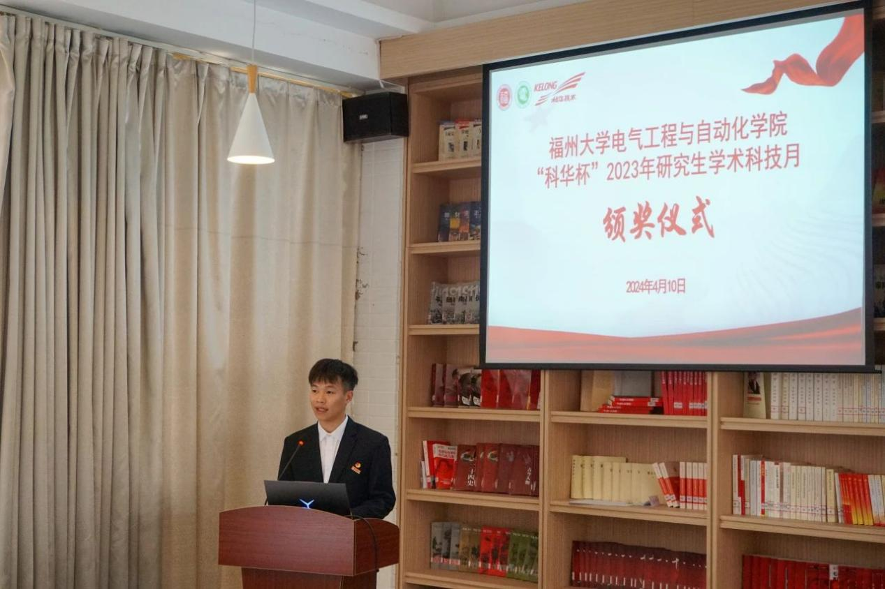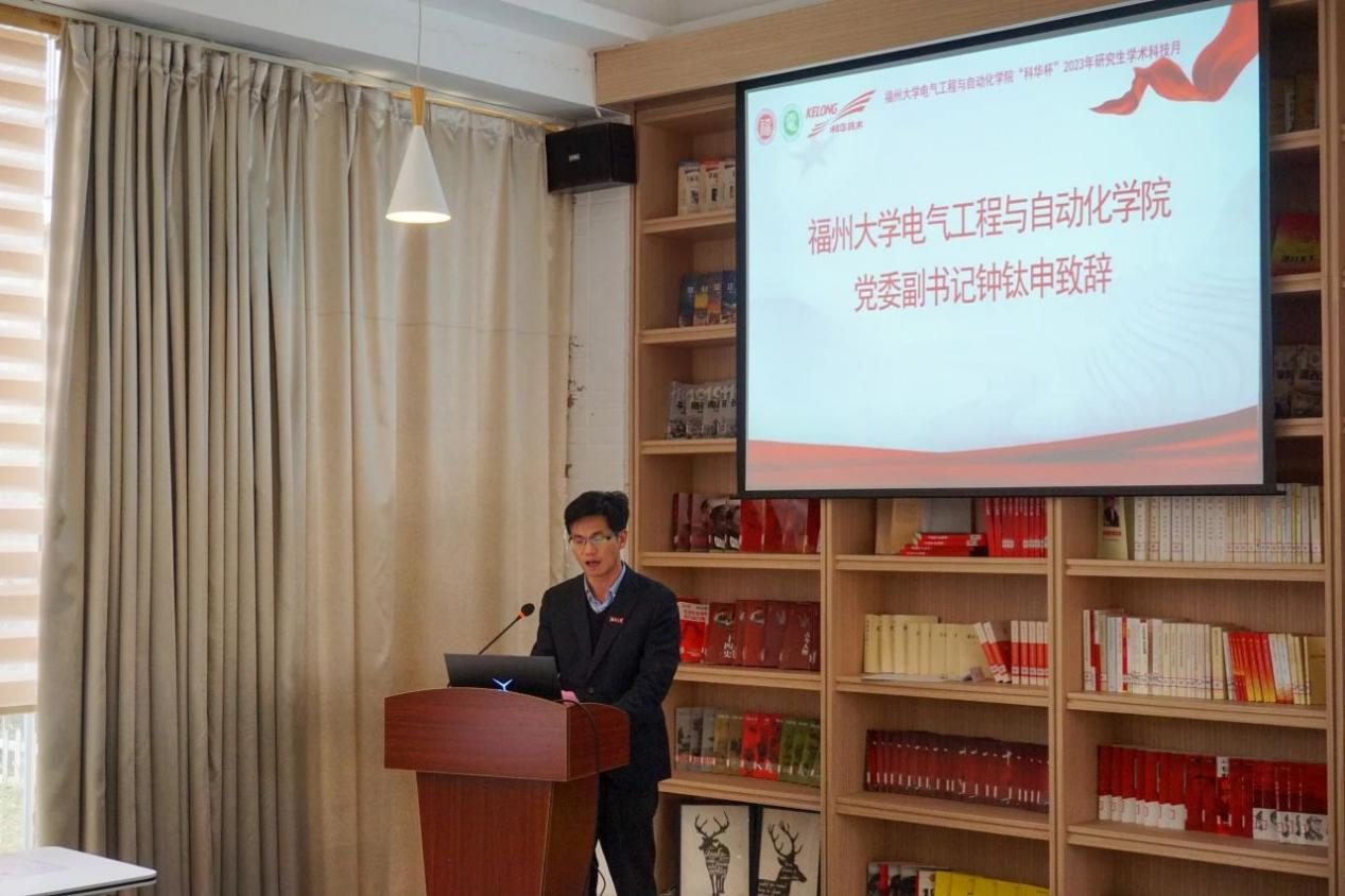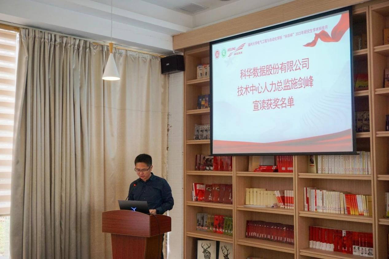 随后,科华数据股份有限公司技术总工易龙强博士致辞。他向在场同学介绍了科华公司的辉煌发展历程,并表达了对福大学子的热忱欢迎。易博士高度评价了学术科技月活动获奖队伍的优异表现,并提出了宝贵的建议,鼓励同学们多做实物,积极参与各类科技竞赛。鉴于赛道的高度契合,易博士鼓励获奖队伍积极参与“炬火种·燃新薪”厦门火炬高新区高校专业新星挑战大赛,在更广阔的舞台展现才华。最后,易博士表达了深化科华公司与学院合作交流的愿望,期待双方能够共同推动产学研深度融合,为社会培养更多优秀人才。