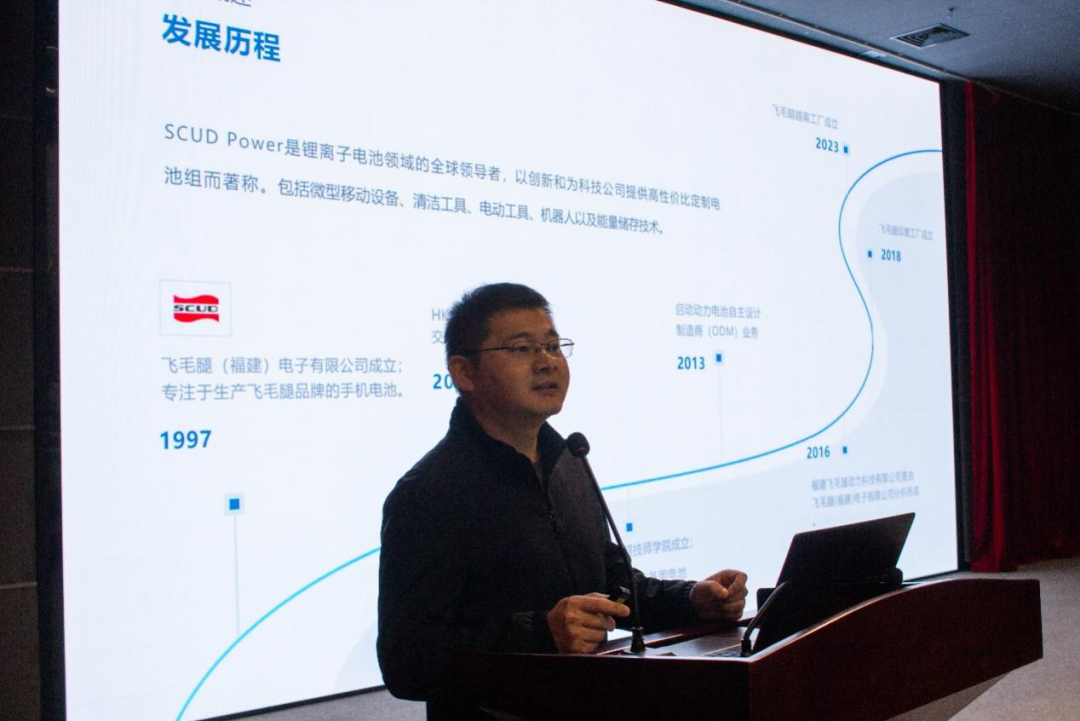接下来是由王维乐高级工程师为大家带来的精彩讲座。王维乐工程师围绕“深耕,潜行,躬身入局”的主题,和大家分享他在锂离子电池领域的探索历程以及他如何秉持工匠精神,深耕细作,凭借创新技术和严谨的工作态度,和团队一同研发出高性价比的定制电池组,引领行业前行。王维乐工程师首先介绍了飞毛腿动力科技有限公司的系列产品,包括其在电池技术领域的最新研发成果。通过详细的产品介绍和公司发展历程,同学们对飞毛腿公司的技术实力和市场竞争力有了更全面的认识。